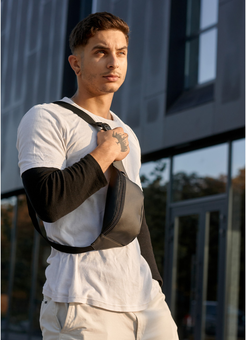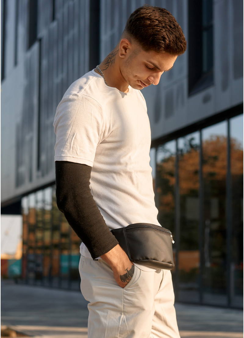 Чоловіча бананка Sambag Tirso Msh чорного кольору виконана з екошкіри. В середині підкладка з матеріалу оксфорд. Підкладка бере на себе навантаження, завдяки чому термін служби бананки значно збільшується. Вона має якісну пластикову блискавку з металевими бігунками з фіксаторами, тому самостійно сумка відкриватись не буде. Ззаду бананка має додаткове відділення на блискавці. Всередині сумки декілкька кишень. Ремінець регулюється від 86 см до 123 см, завдяки чому її можна зручно носити як на поясі, так і через плече.