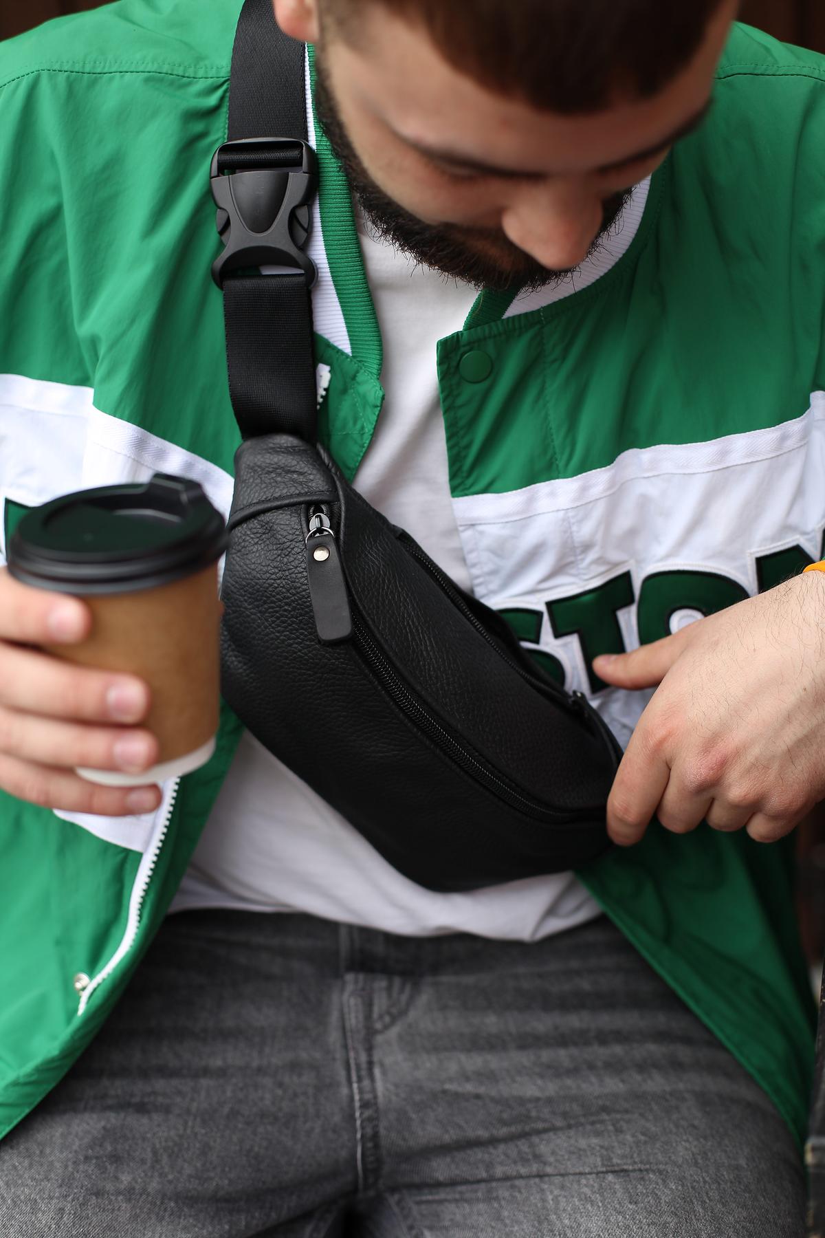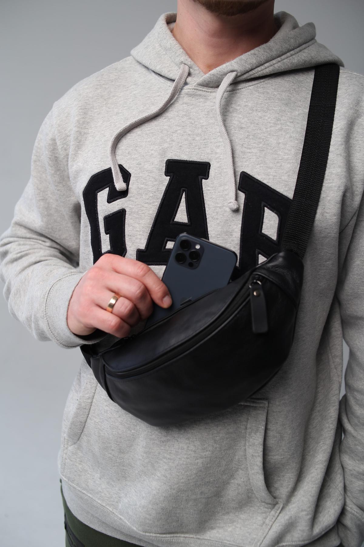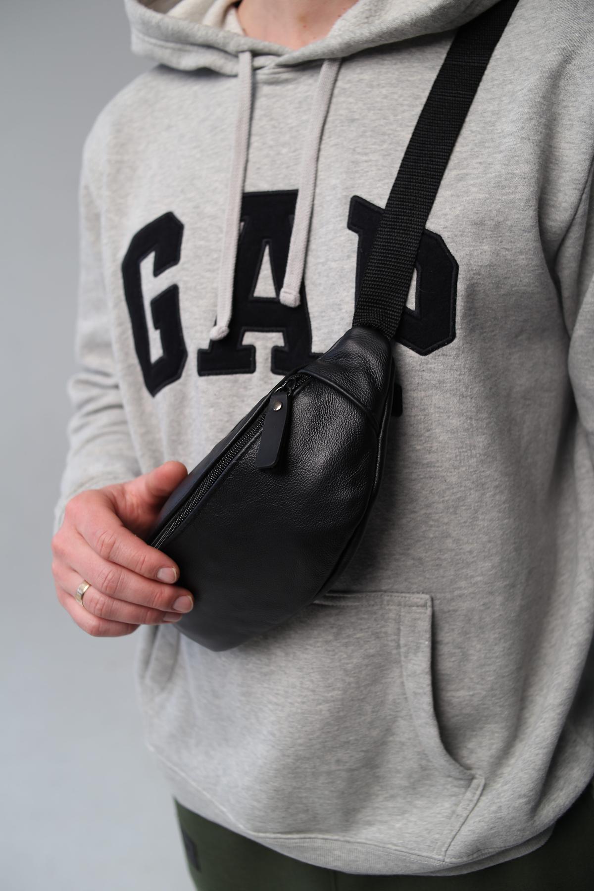 Чоловіча бананка Skill чорного кольору виконана із натуральної шкіри КРС. У бананки одне основне відділення, а також додаткове ззаду, куди можна покласти телефон або документи. Бананка оснащена пластиковими блискавками. Ремінець регулюється до 125 см.