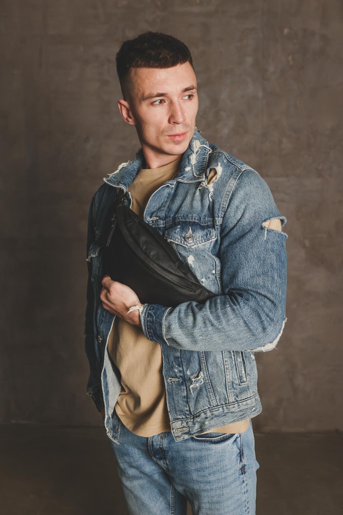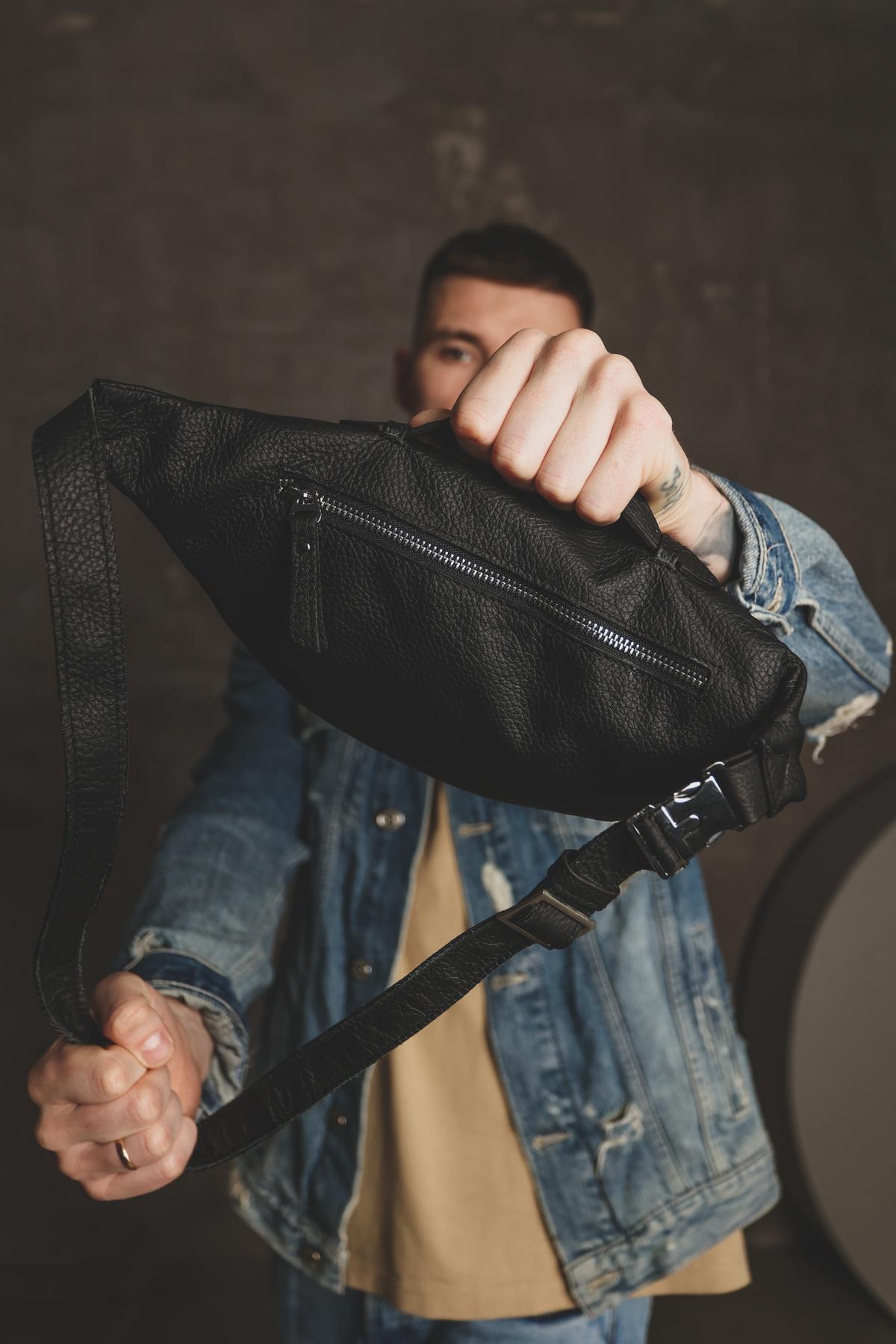 Чоловіча бананка Skill Dark чорного кольору виконана із натуральної шкіри КРС. У бананки одне основне відділення, а також додаткове відділення позаду, на металевих блискавках. У бананки є шкіряна ручка, щоб за потреби її можна було тримати в руці. Ремінець регулюється до 100 см. Ширина бананки 29 см, висота 13 см, довжина 8 см, вона досить велика та зможе вмістити в собі всі необхідні речі.