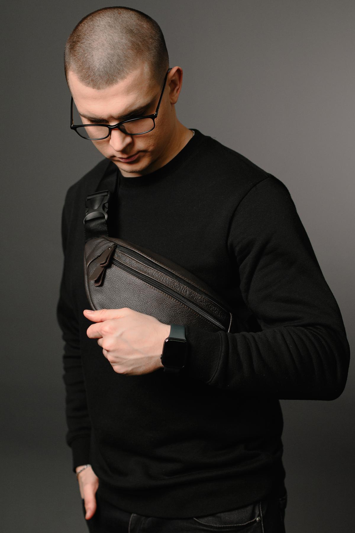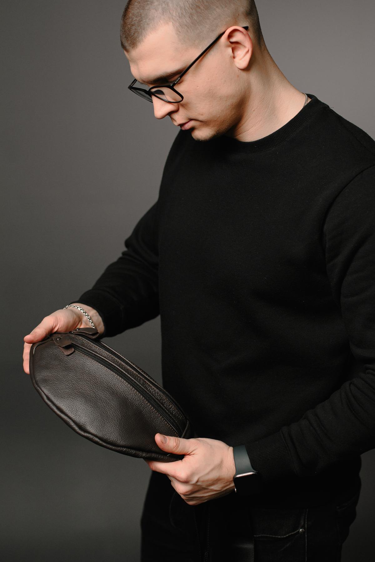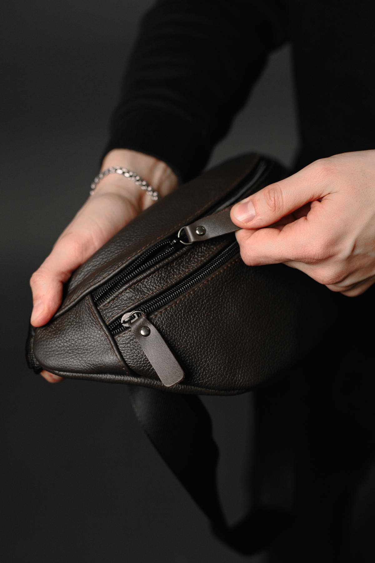 Чоловіча бананка Skill коричневого кольору виконана із натуральної шкіри КРС. У бананки одне основне відділення, а також два додаткових спереду та ззаду, всі вони на пластиковій блискавці. Ремінець регулюється до 120 см. Бананка досить велика, тому ви зможете помістити в неї всі необхідні речі.