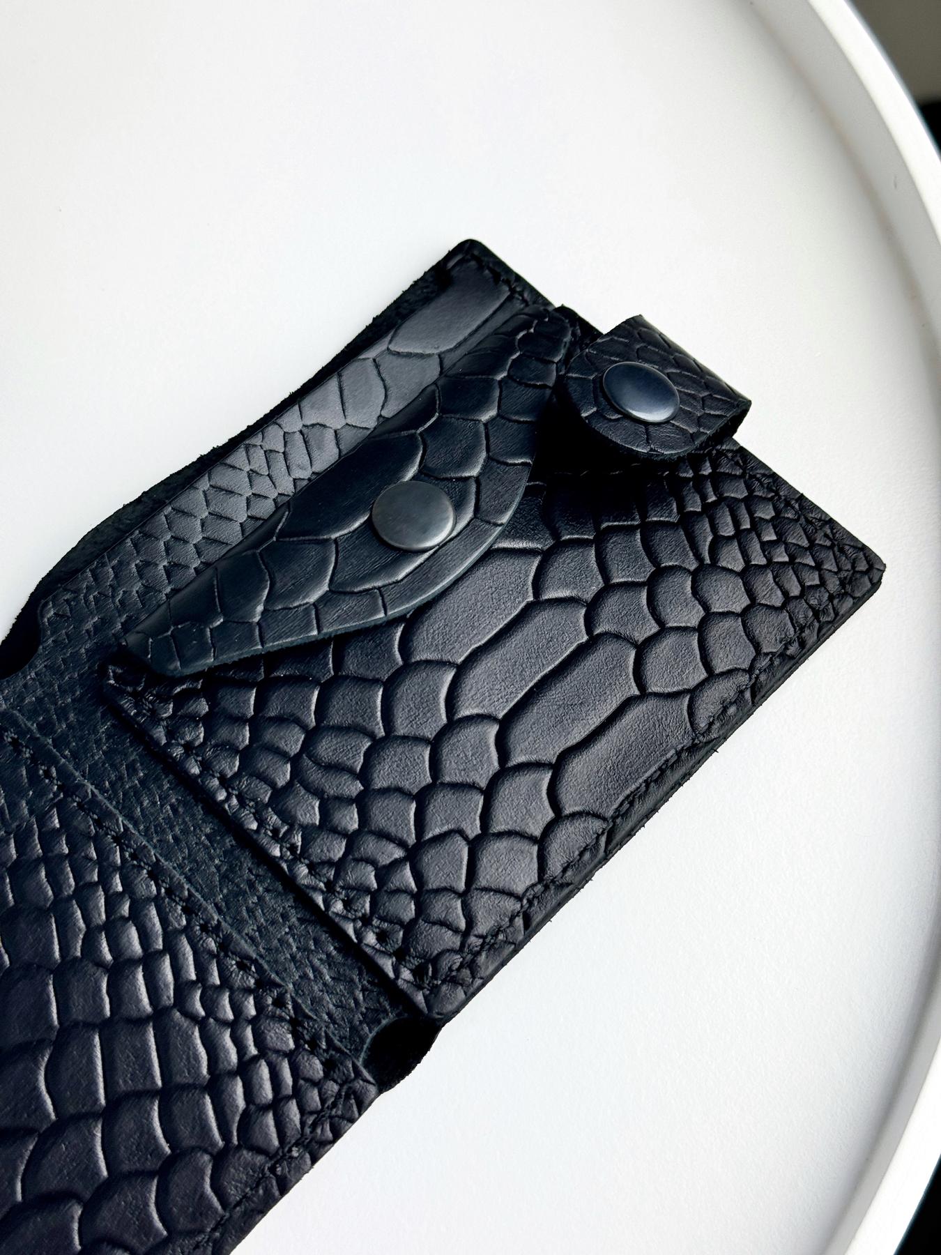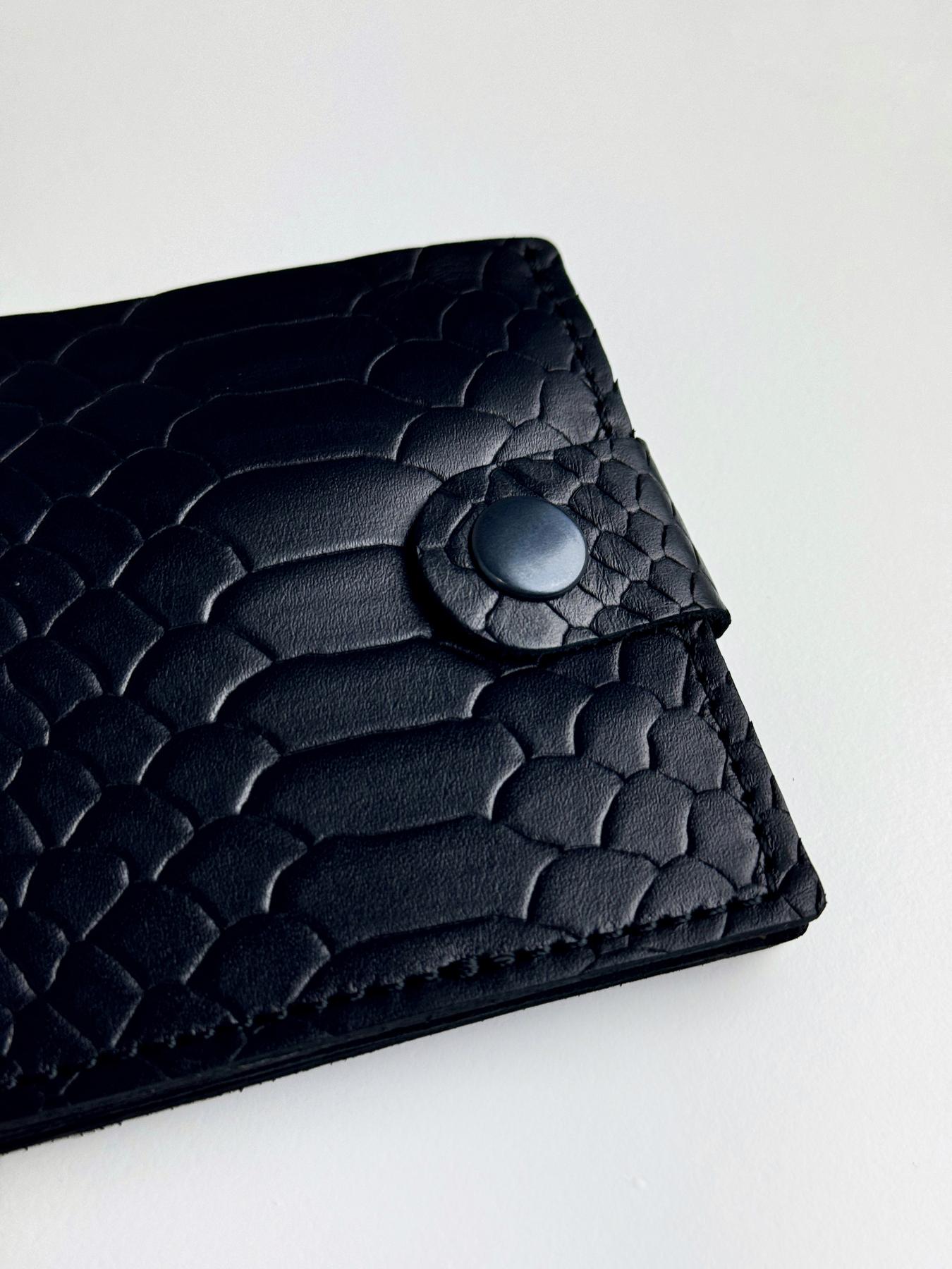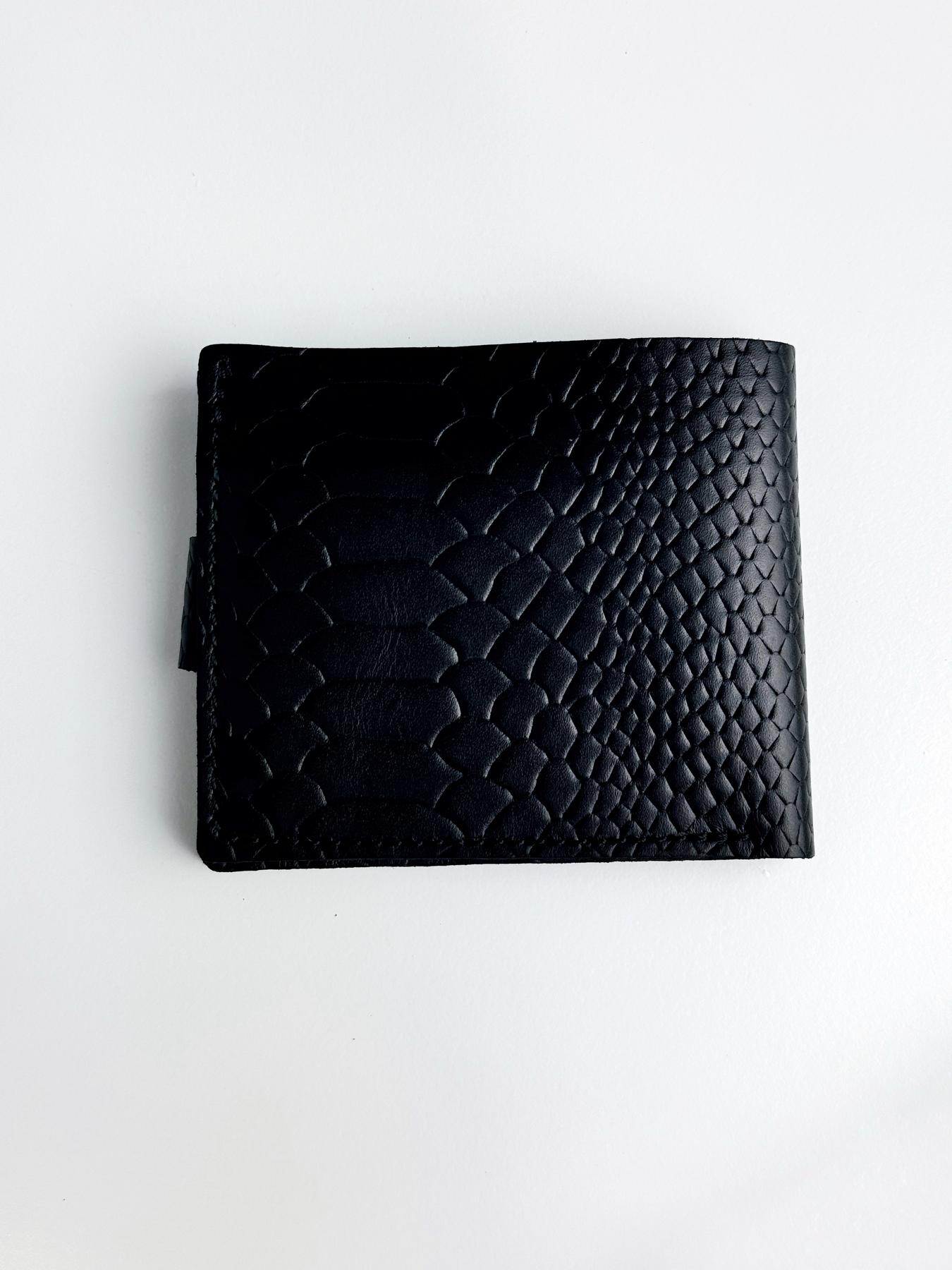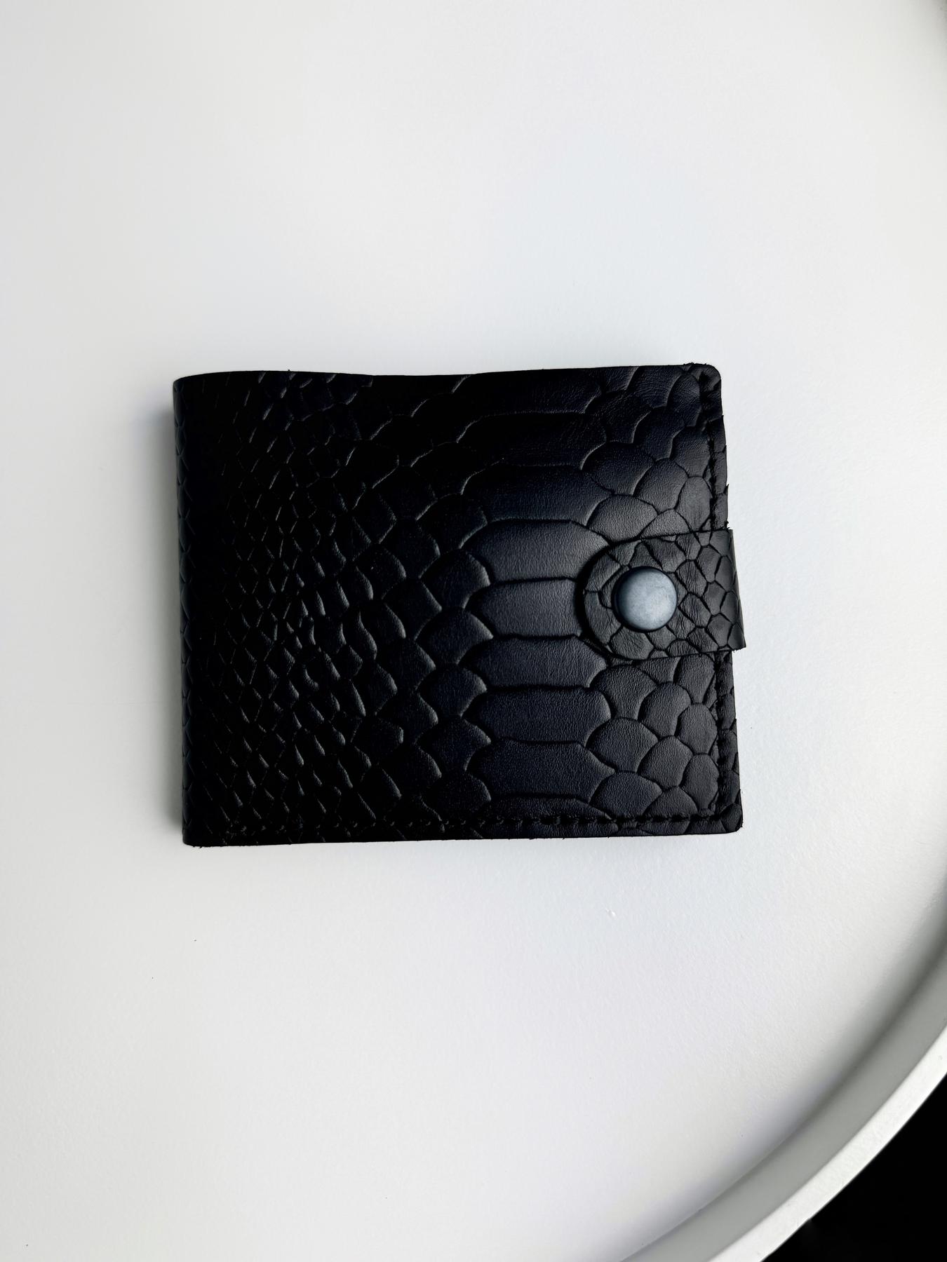 Чоловічий гаманець біфолд Skill чорного кольору виконаний з натуральної шкіри. Гаманець застібається металевою кнопкою, має основне відділення для купюр, три осередки для карток та одне відділення для монет на кнопці.