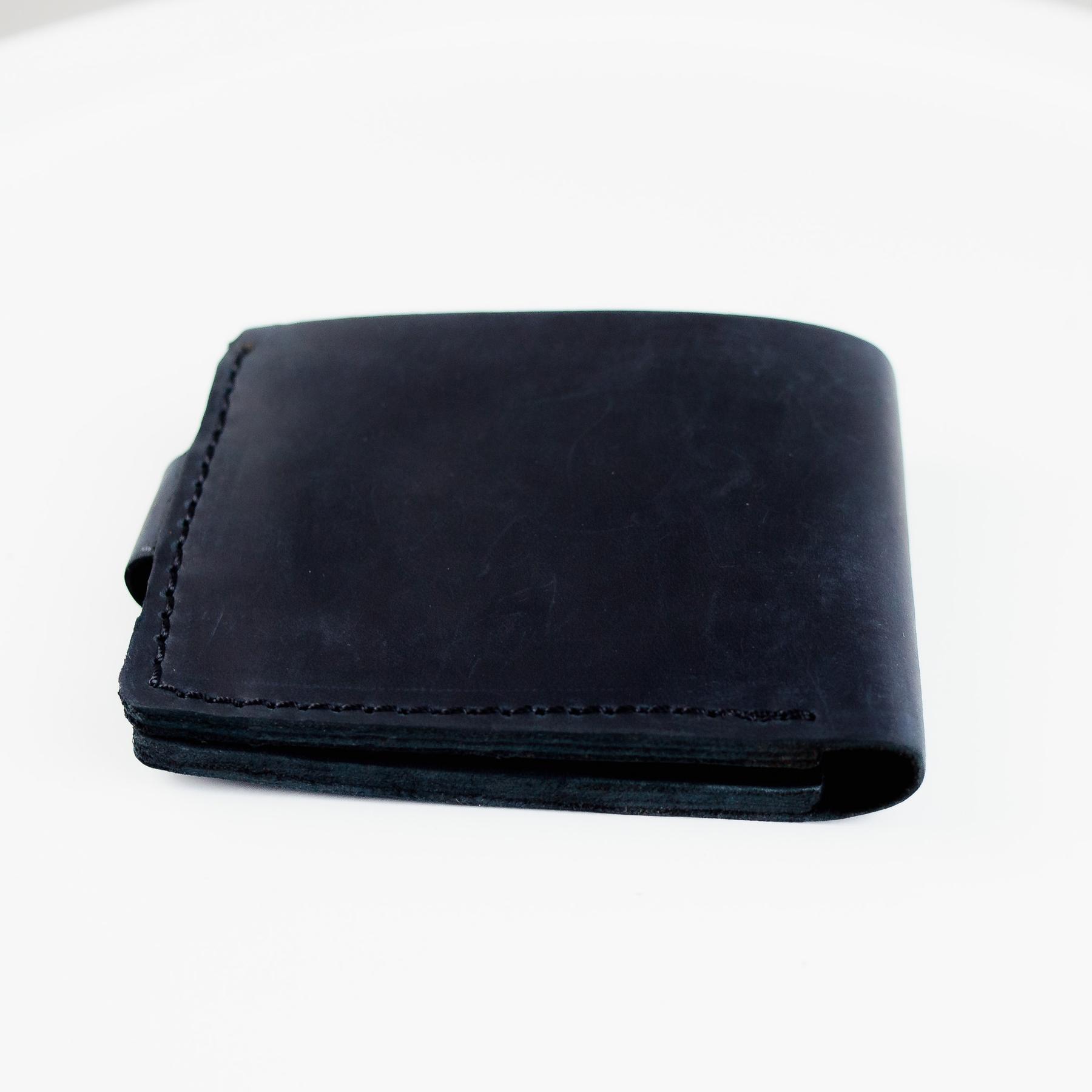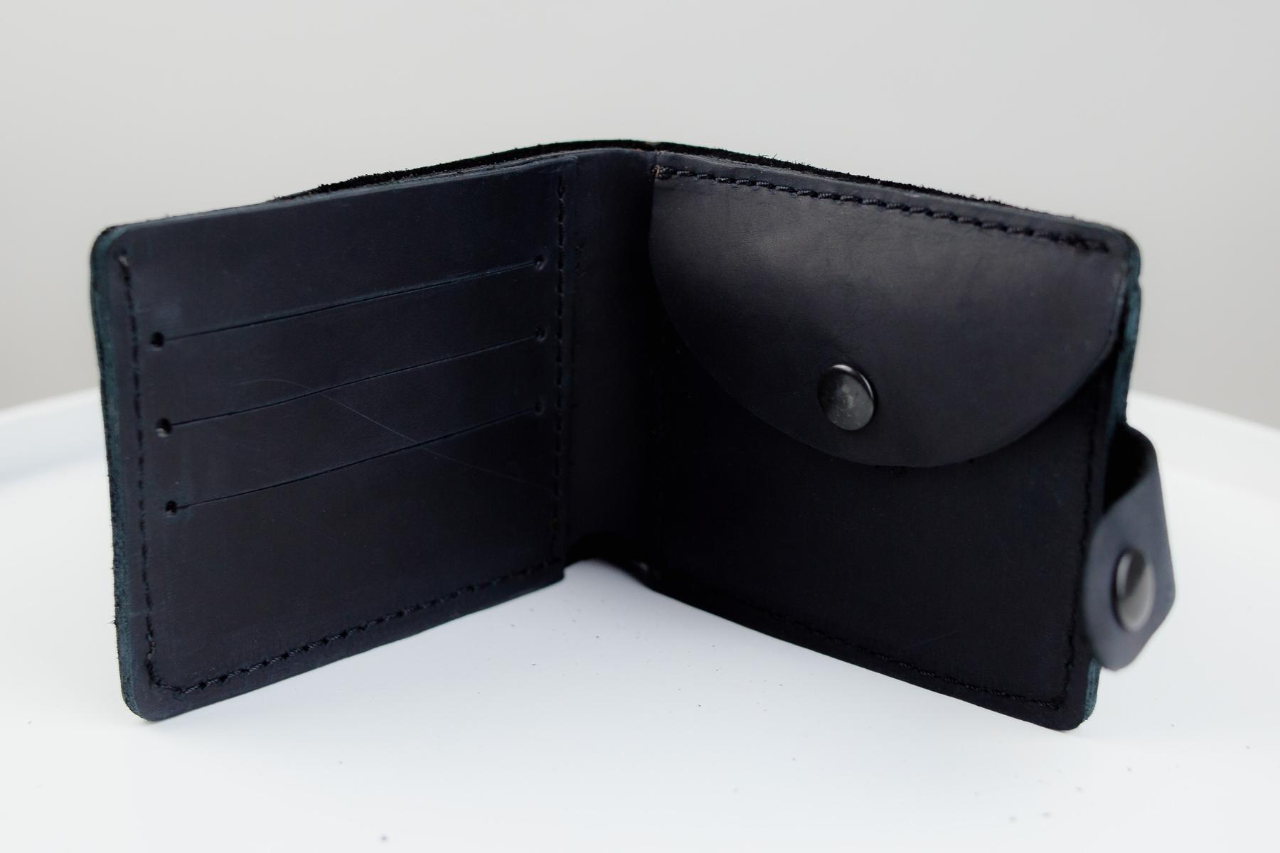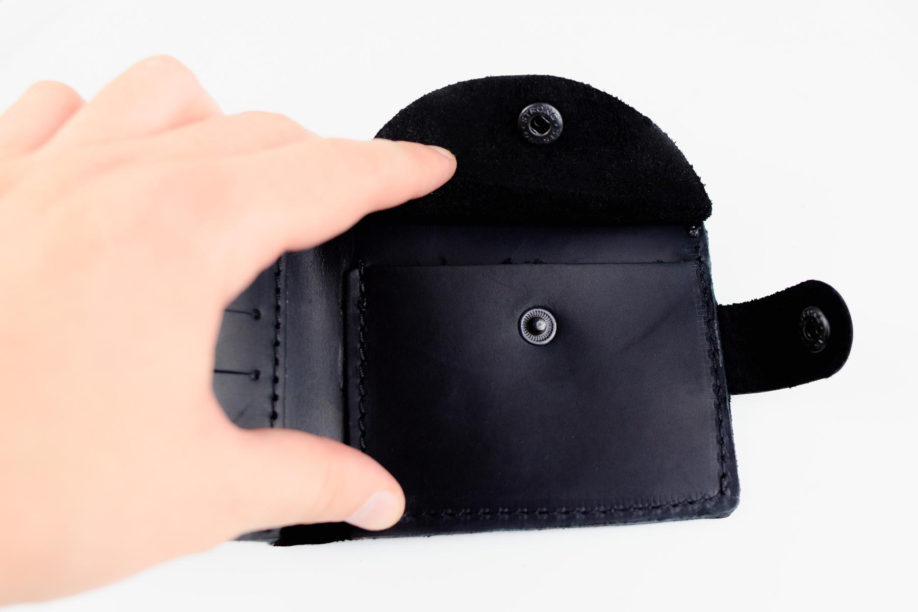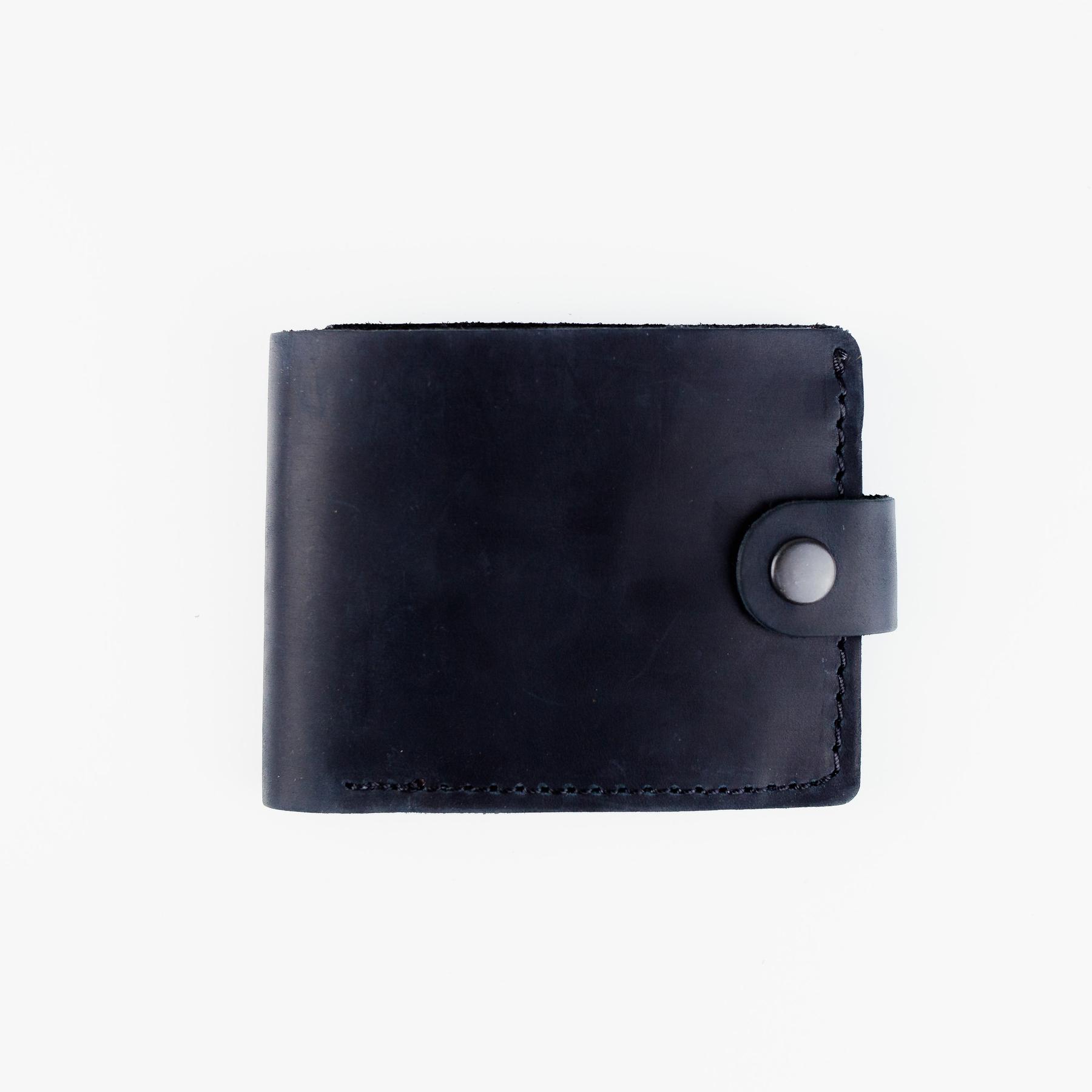 Чоловічий гаманець Skill чорного кольору виконаний з натуральної шкіри. Гаманець застібається металевою кнопкою, має основне відділення для купюр, 4 осередки для карток та одне відділення для монет на кнопці.