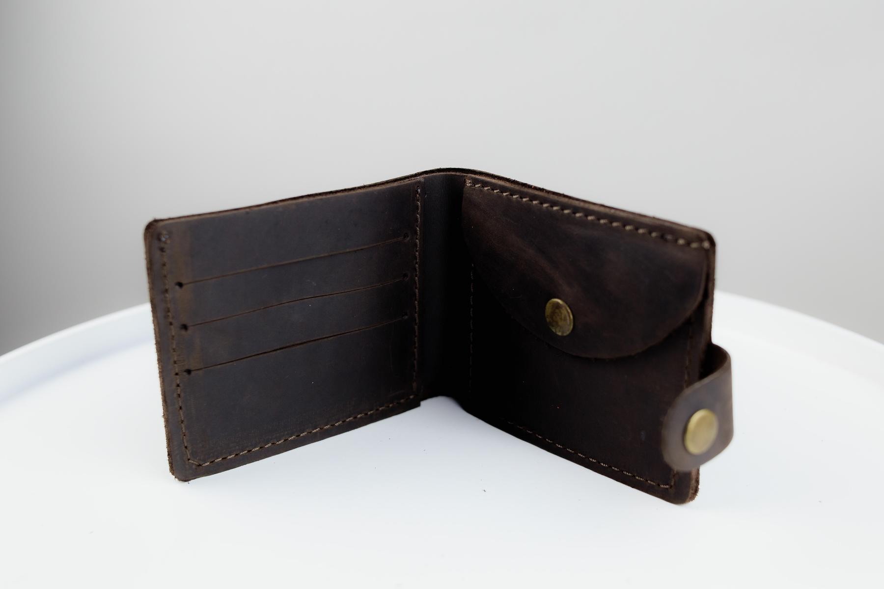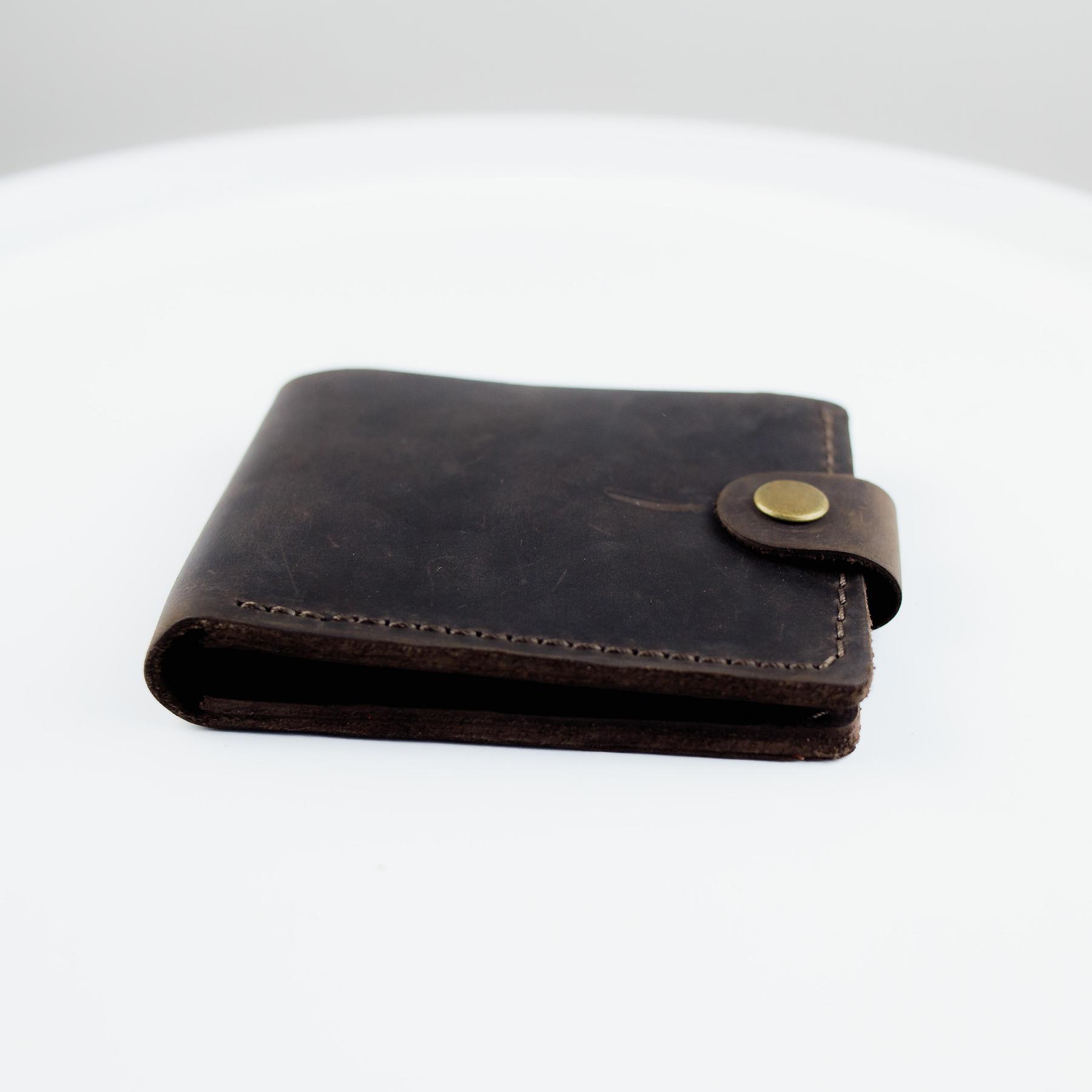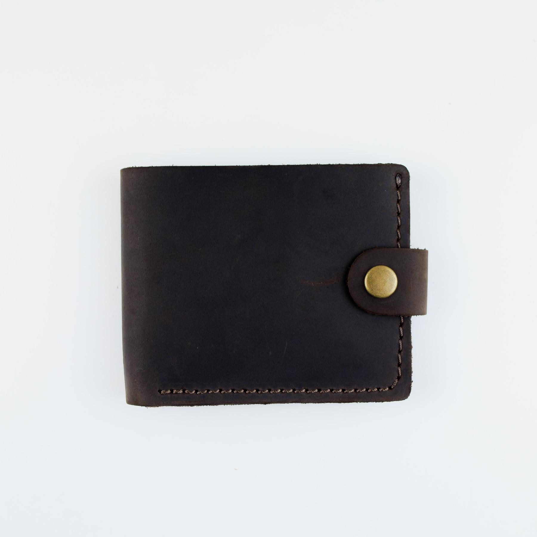 Чоловічий гаманець Skill коричневого кольору виконаний з натуральної шкіри. Гаманець застібається металевою кнопкою, має основне відділення для купюр, 4 осередки для карток та одне відділення для монет на кнопці.