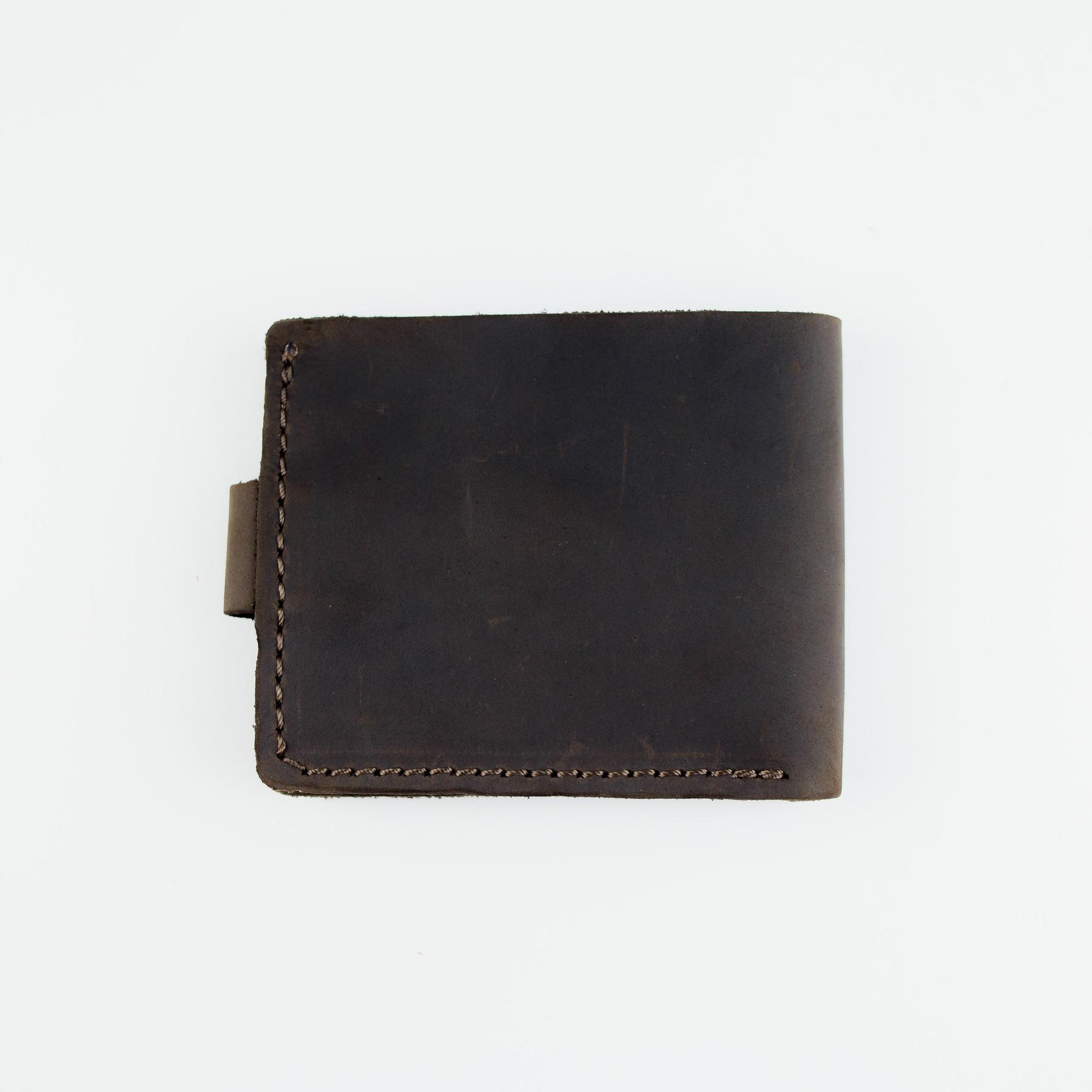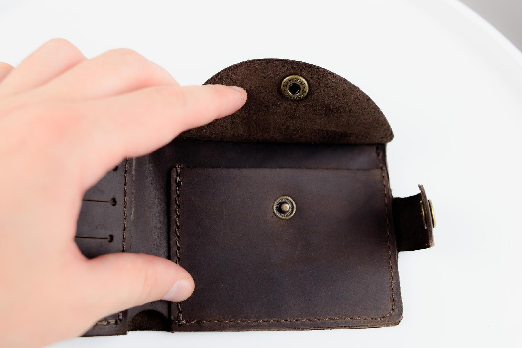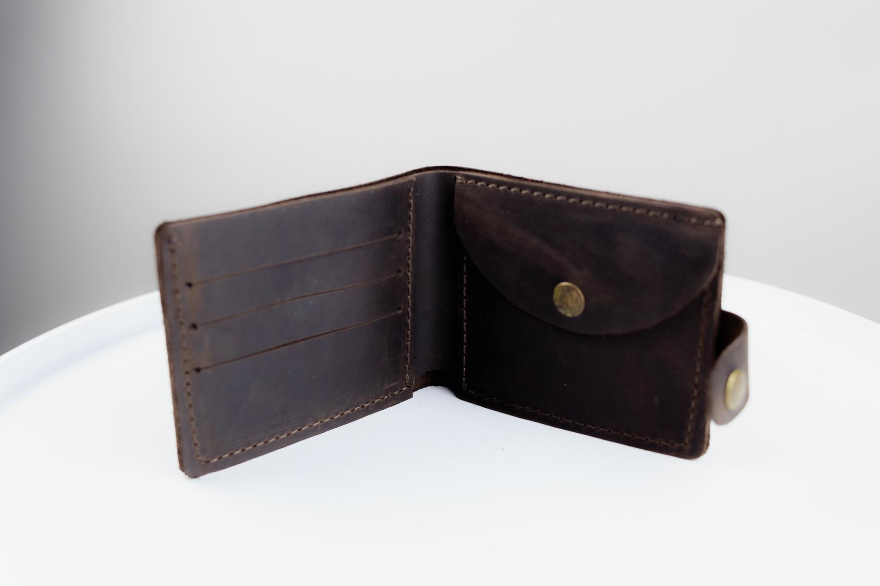Чоловічий гаманець Skill коричневого кольору виконаний з натуральної шкіри. Гаманець застібається металевою кнопкою, має основне відділення для купюр, 4 осередки для карток та одне відділення для монет на кнопці.