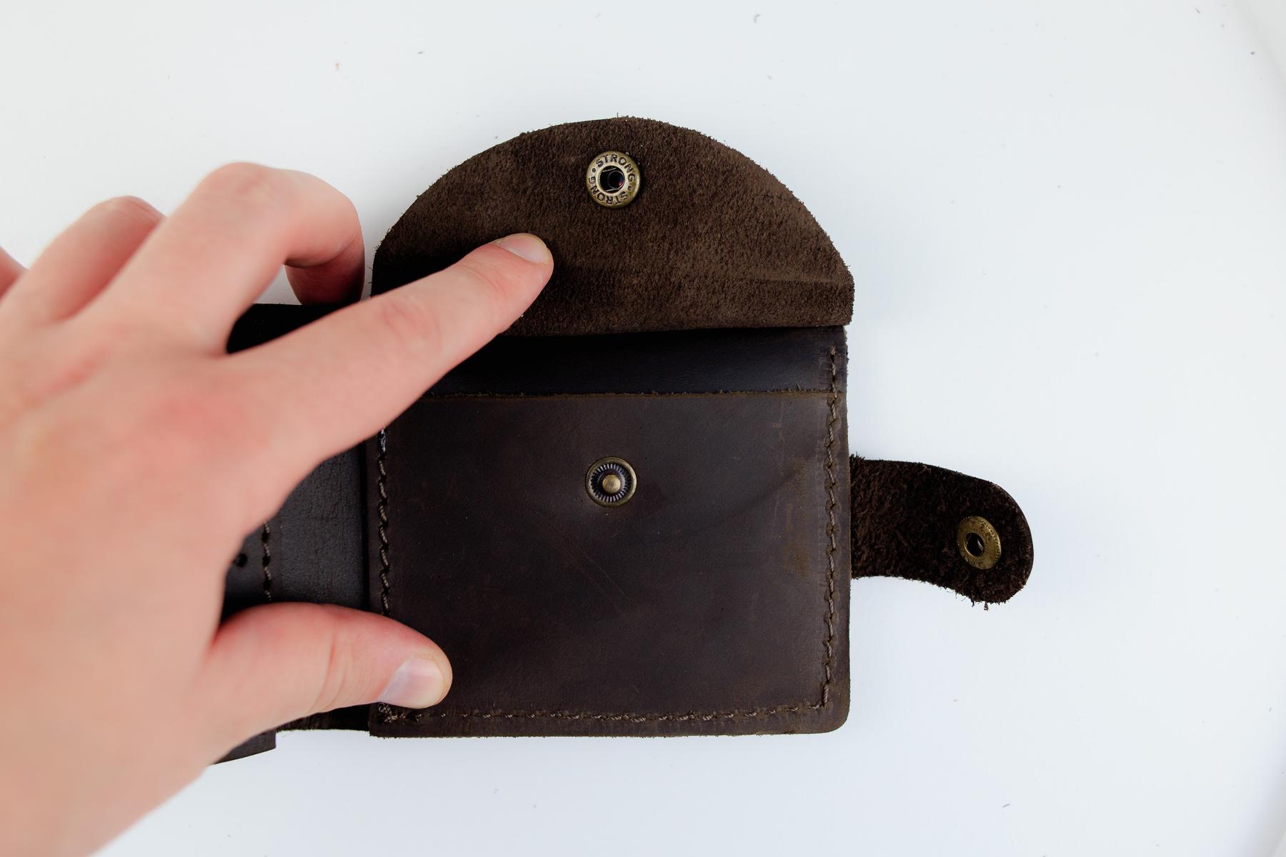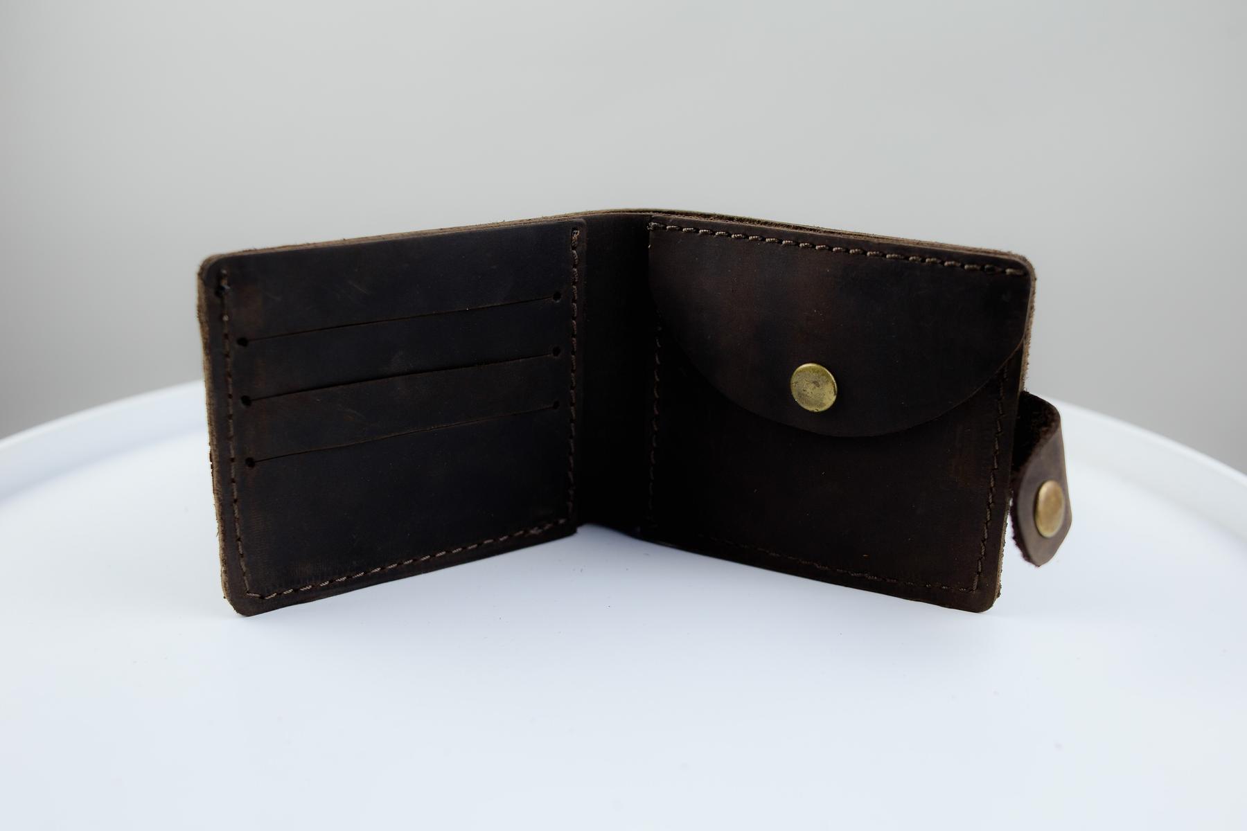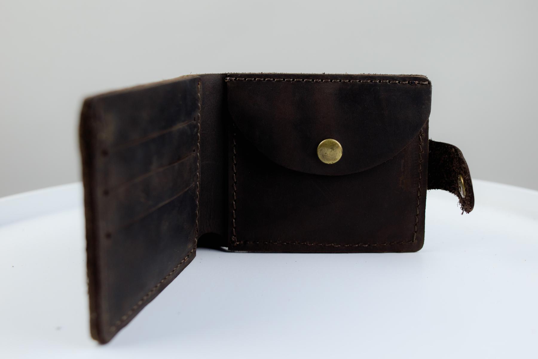 Чоловічий гаманець Skill коричневого кольору виконаний з натуральної шкіри. Гаманець застібається металевою кнопкою, має основне відділення для купюр, 4 осередки для карток та одне відділення для монет на кнопці.