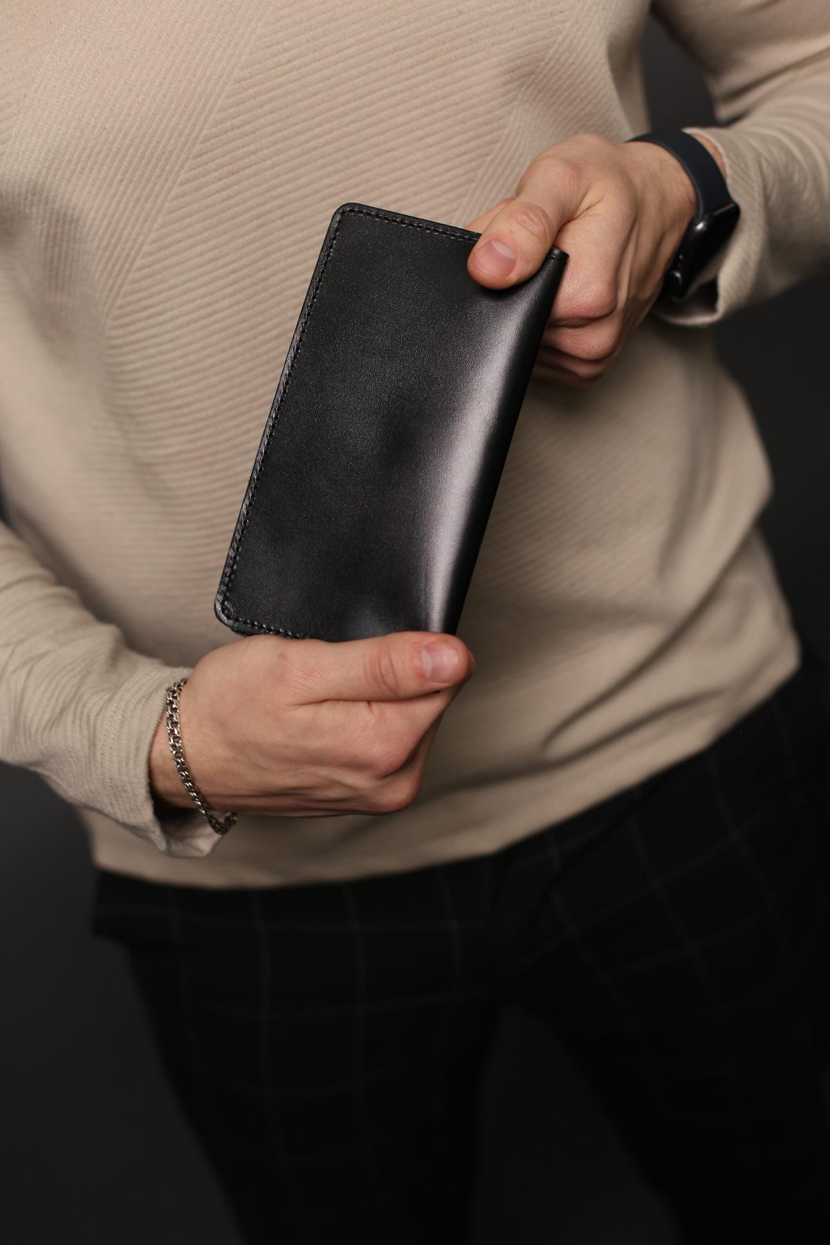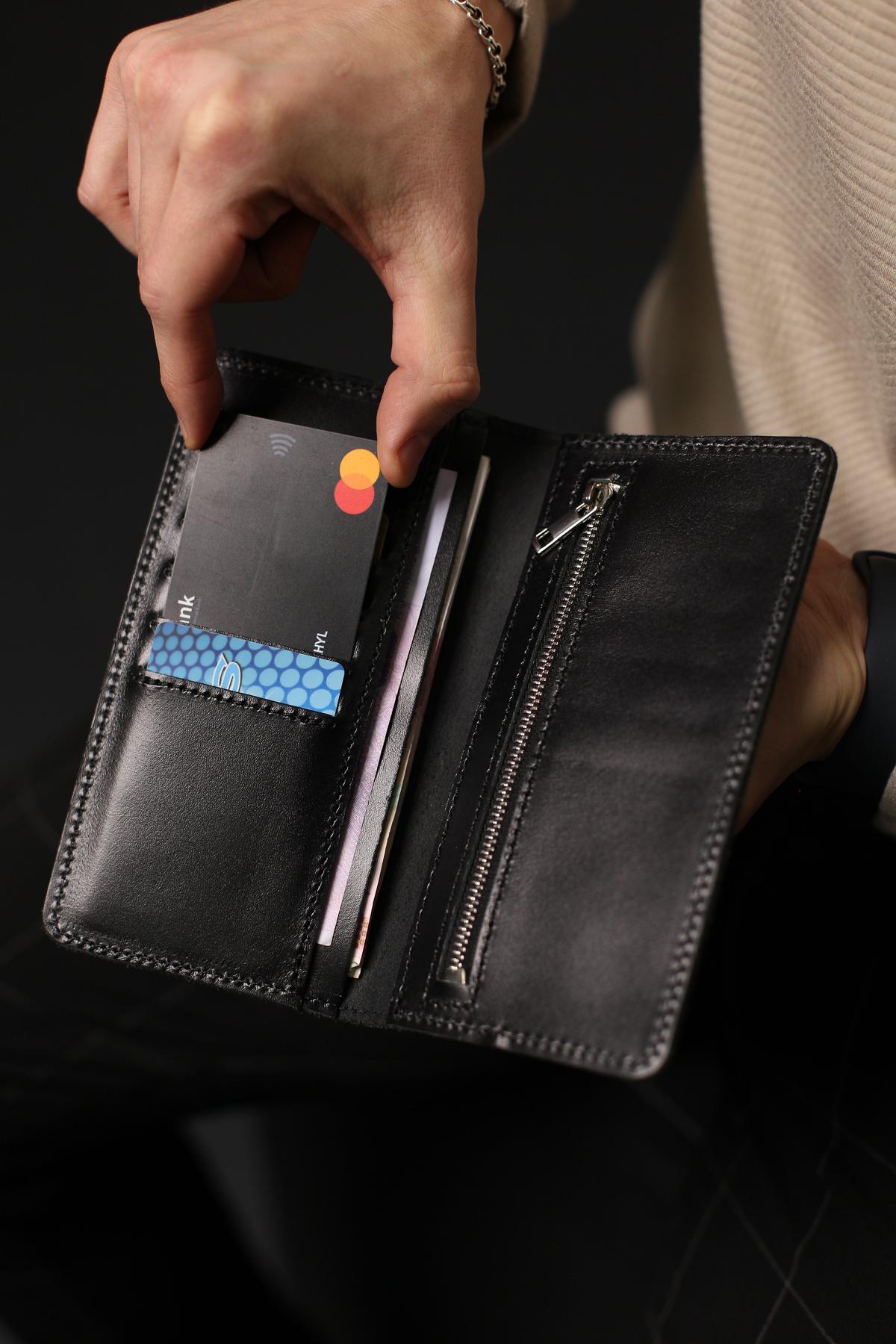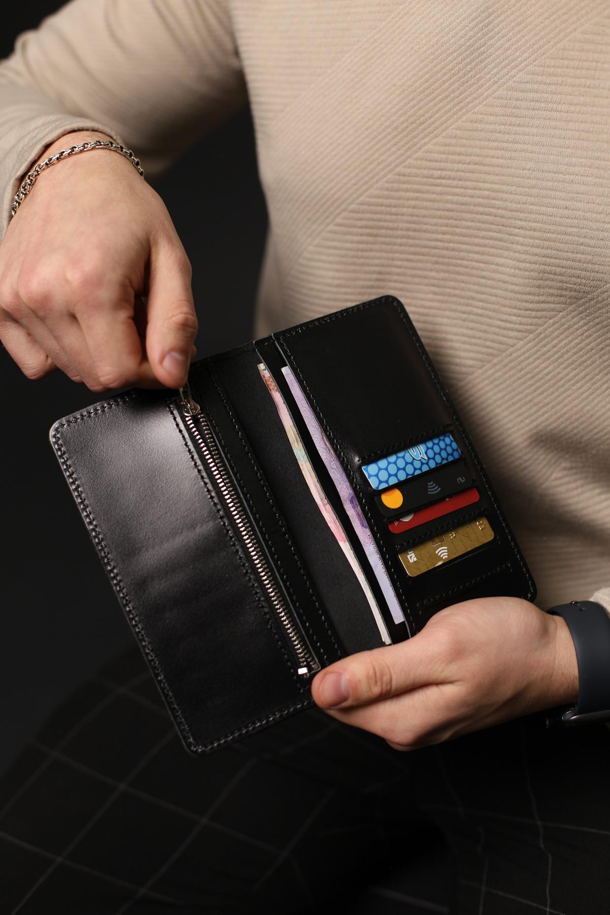 Портмоне чоловіче Skill чорного кольору виготовлене з натуральної шкіри. Портмоне має три основні відділення для купюр, 6 осередків для карток та додаткове відділення на металевій блискавці.