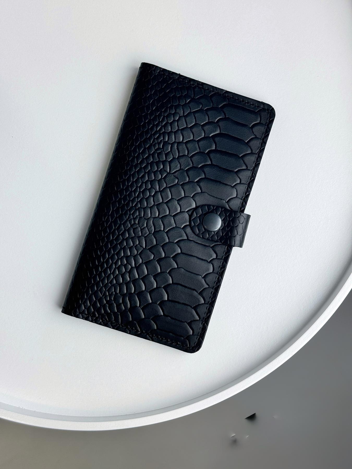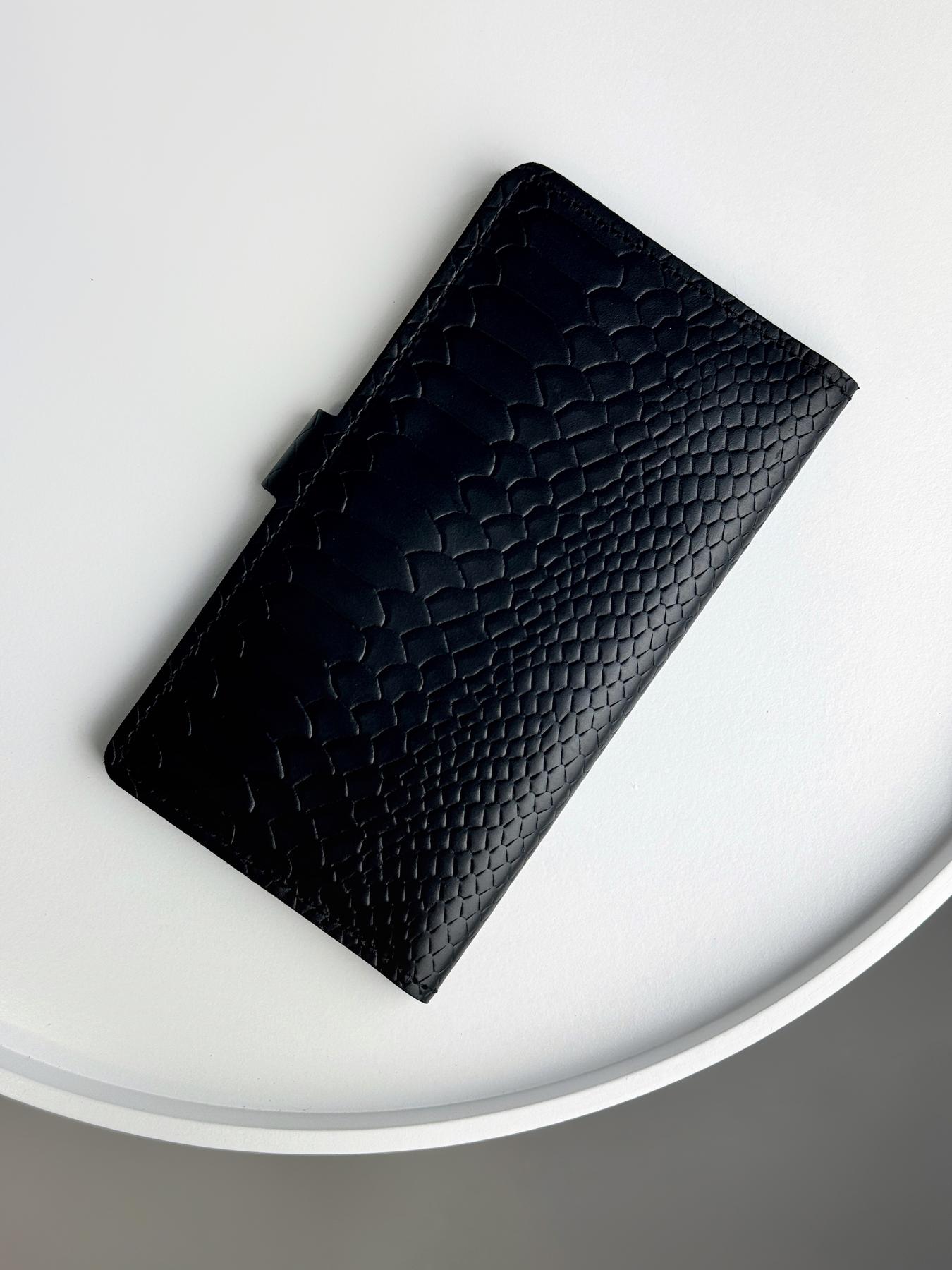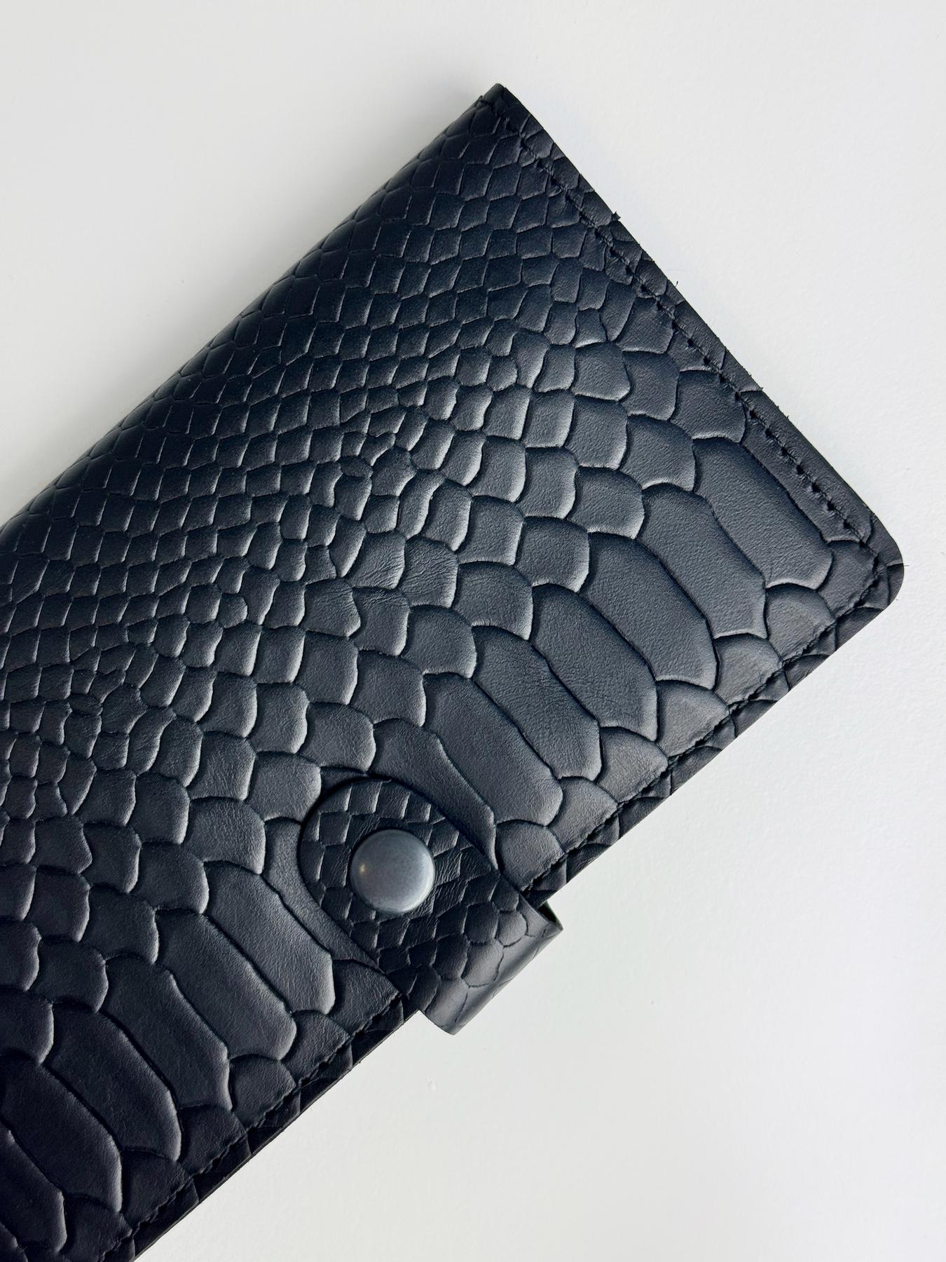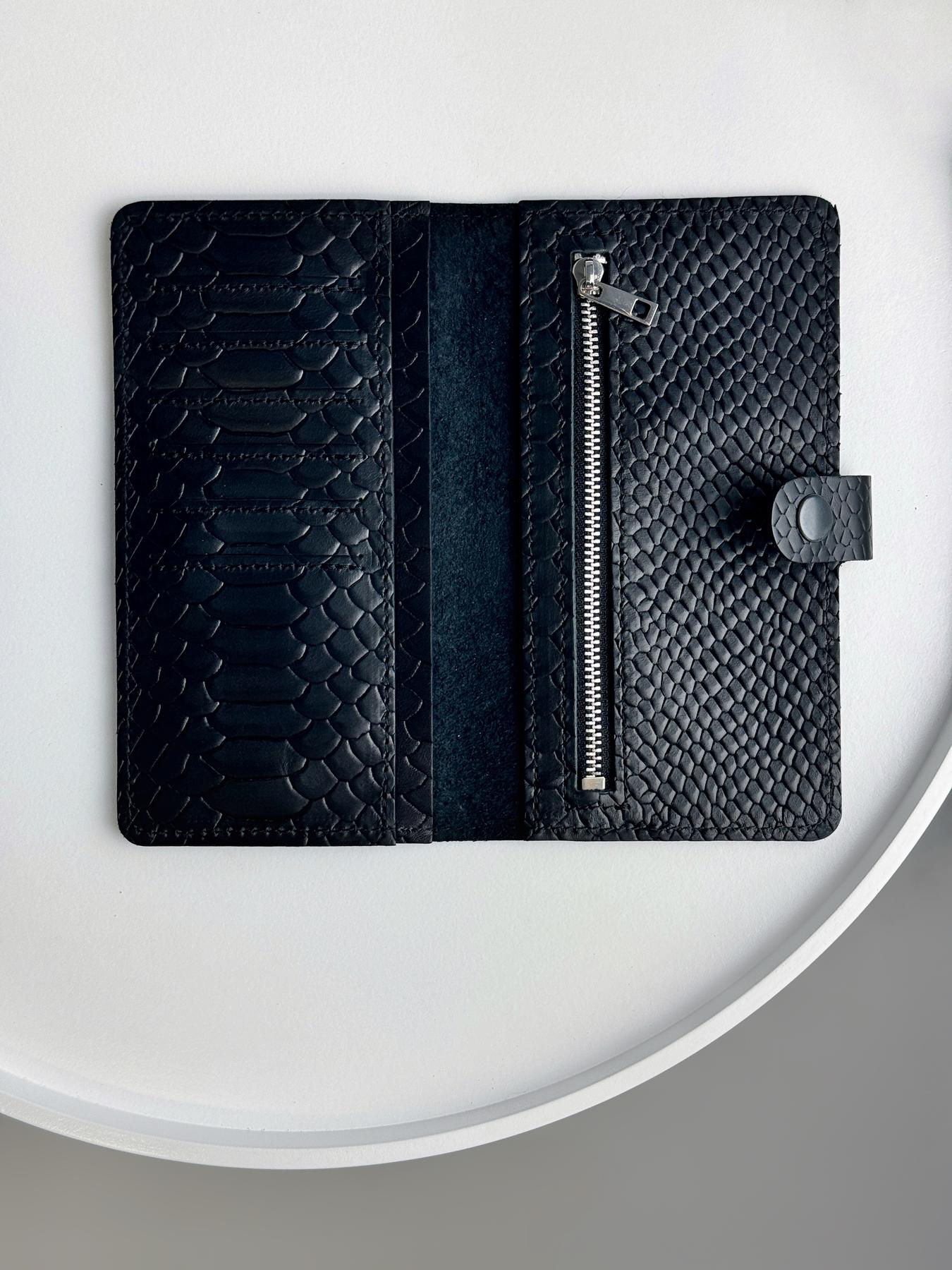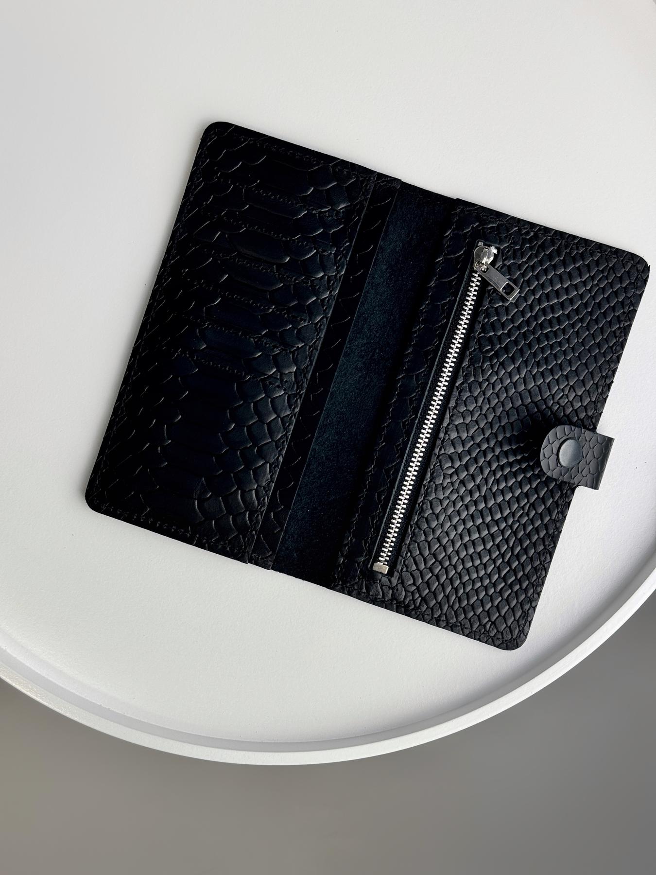 Портмоне чоловіче Skill чорного кольору виготовлене з натуральної шкіри. Портмоне застібається металевою кнопкою, має три основні відділення для купюр, 6 осередків для карток та додаткове відділення на металевій блискавці.