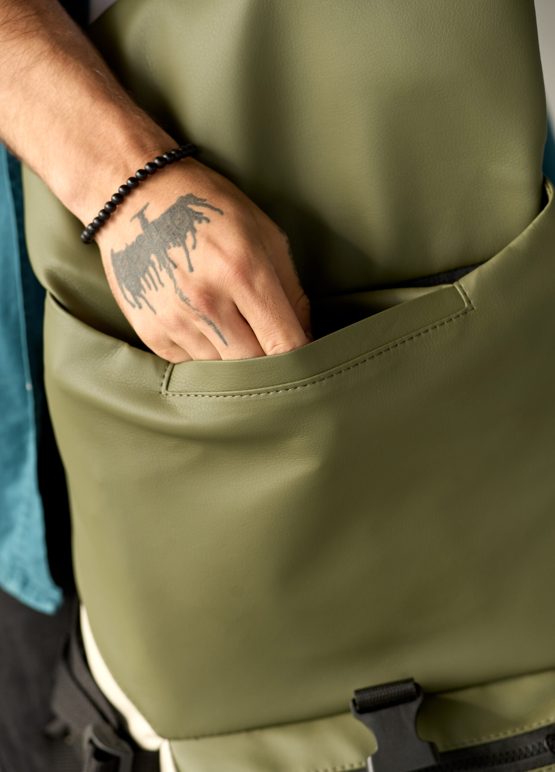 В середині міцний нетканний чорний матеріал, з ним Ви можете не переживати, що поклали в середину ключі, відкриті ручки чи олівці, тощо, адже він, на відміну від дешевої підкладки, практично не рветься і легко чиститься.