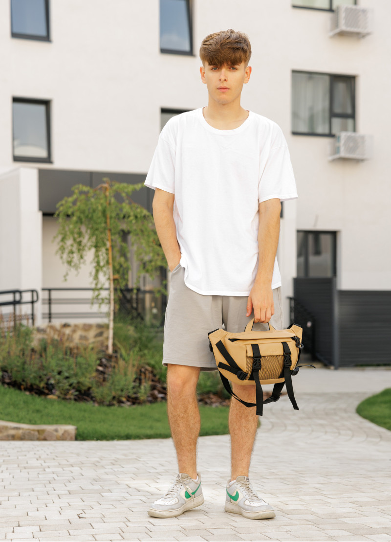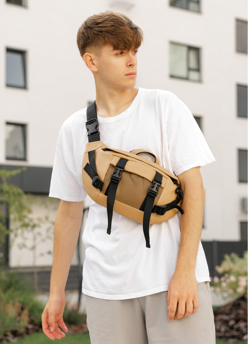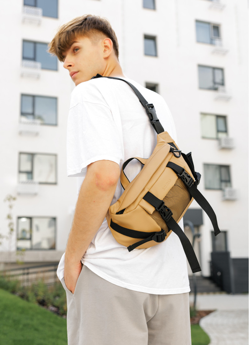 Чоловіча сумка-бананка Sambag Dynamicdart бежевого кольору має 9 відділень та виконана з якісного поліестеру. В середині підкладка з матеріалу оксфорд. Сумка має якісну пластикову блискавку з металевими бігунками з фіксаторами, тому самостійно сумка відкриватись не буде. Окрім основого відділення бананка має дві відкриті кишені, одну велику кишеню на блискавці в якій ще три відкриті кишені. На зовнішній стороні спереду карман із сітки. Позаду бананки дві відкриті кишені. Ремінець регулюється від 86 см до 168 см, завдяки чому її можна зручно носити як поясну сумку, так і як повноцінну через плече.