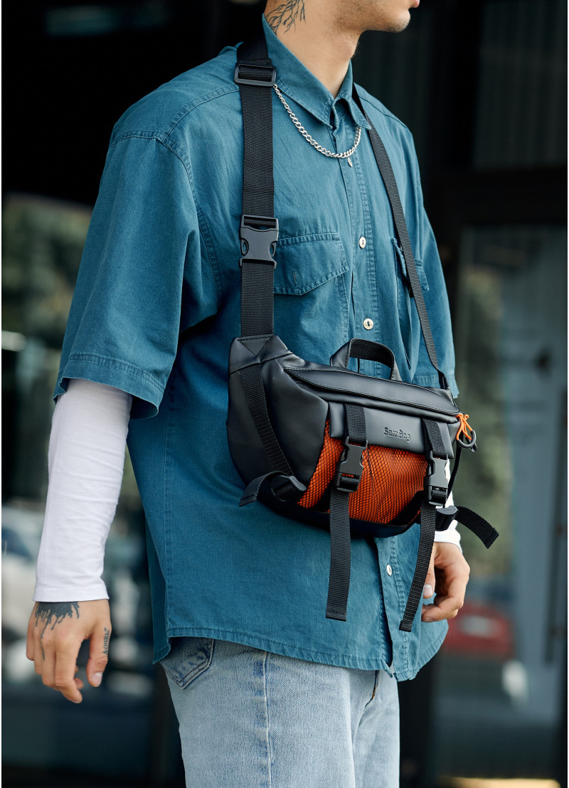 Чоловіча сумка-бананка Sambag Dynamicdart чорного кольору з помаранчевою вставкою має 9 відділень та виконана з якісного поліестеру. В середині підкладка з матеріалу оксфорд. Сумка має якісну пластикову блискавку з металевими бігунками з фіксаторами, тому самостійно сумка відкриватись не буде. Окрім основого відділення бананка має дві відкриті кишені, одну велику кишеню на блискавці в якій ще три відкриті кишені. На зовнішній стороні спереду карман із сітки. Позаду бананки дві відкриті кишені. Ремінець регулюється від 86 см до 168 см, завдяки чому її можна зручно носити як поясну сумку, так і як повноцінну через плече.