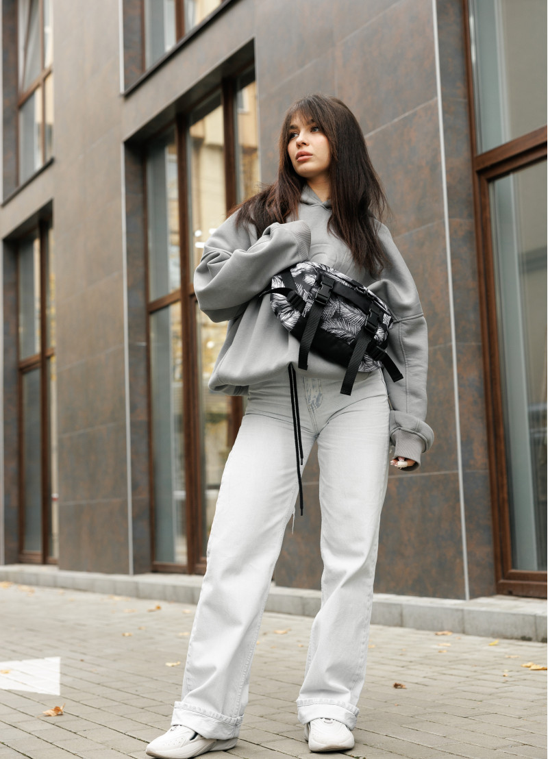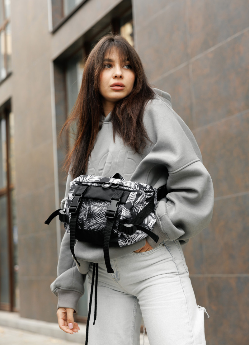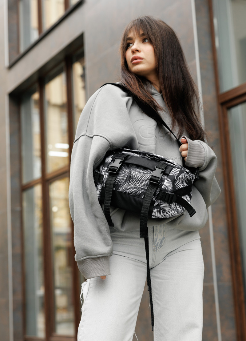 Жіноча сумка-бананка Sambag Dynamicdart з біло-чорним пальмовим принтом має 9 відділень та виконана з якісного поліестеру. В середині підкладка з матеріалу оксфорд. Сумка має якісну пластикову блискавку з металевими бігунками з фіксаторами, тому самостійно сумка відкриватись не буде. Окрім основого відділення бананка має дві відкриті кишені, одну велику кишеню на блискавці в якій ще три відкриті кишені. На зовнішній стороні спереду карман із сітки. Позаду бананки дві відкриті кишені. Ремінець регулюється від 86 см до 168 см, завдяки чому її можна зручно носити як поясну сумку, так і як повноцінну через плече.