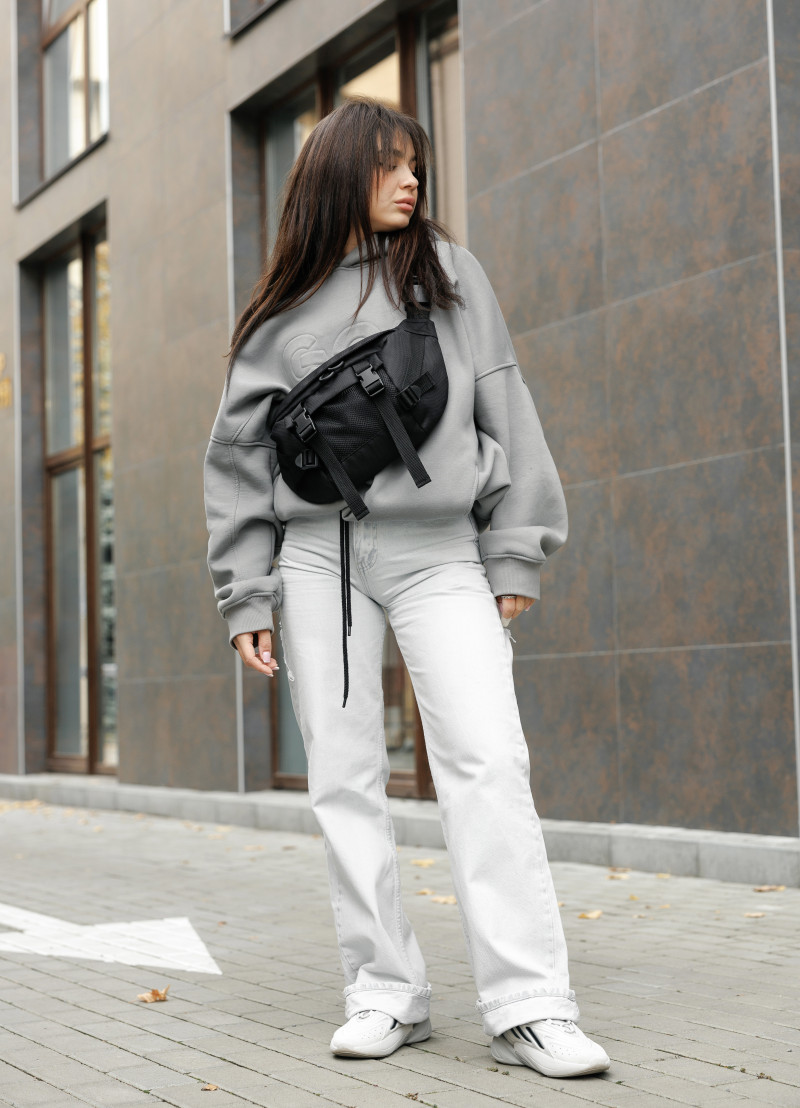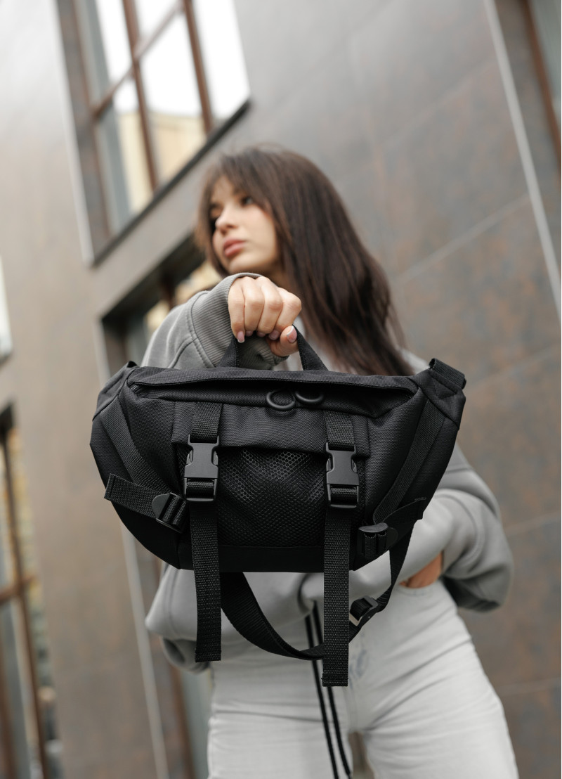 Жіноча сумка-бананка Sambag Dynamicdart з біло-чорним пальмовим принтом має 9 відділень та виконана з якісного поліестеру. В середині підкладка з матеріалу оксфорд. Сумка має якісну пластикову блискавку з металевими бігунками з фіксаторами, тому самостійно сумка відкриватись не буде. Окрім основого відділення бананка має дві відкриті кишені, одну велику кишеню на блискавці в якій ще три відкриті кишені. На зовнішній стороні спереду карман із сітки. Позаду бананки дві відкриті кишені. Ремінець регулюється від 86 см до 168 см, завдяки чому її можна зручно носити як поясну сумку, так і як повноцінну через плече.
