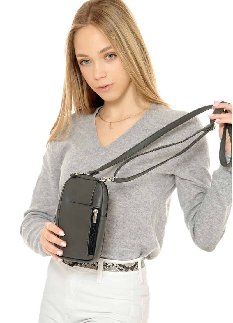 Жіноча сумка для телефону Sambag графітового кольору виконана з якісної зносостійкої екошкіри.