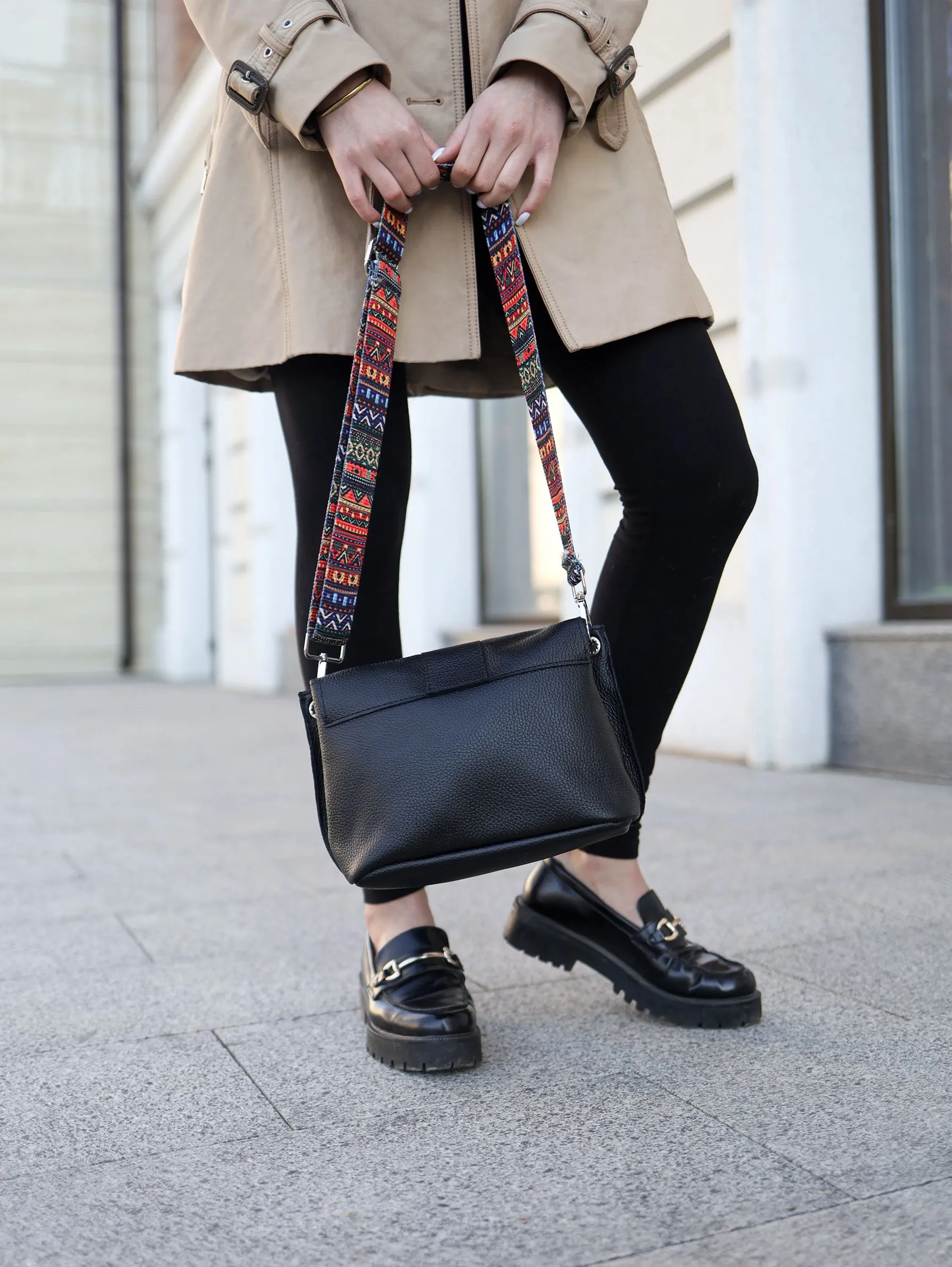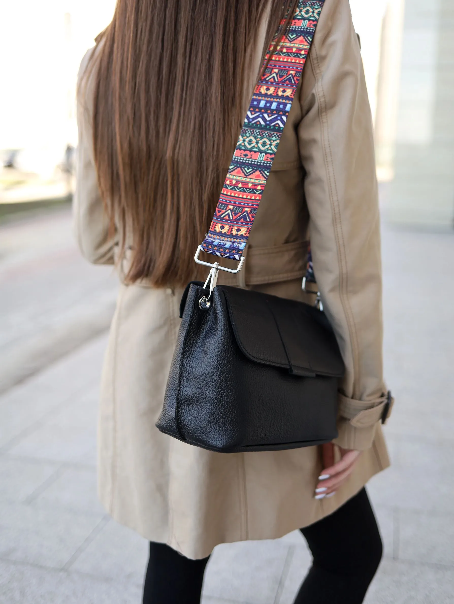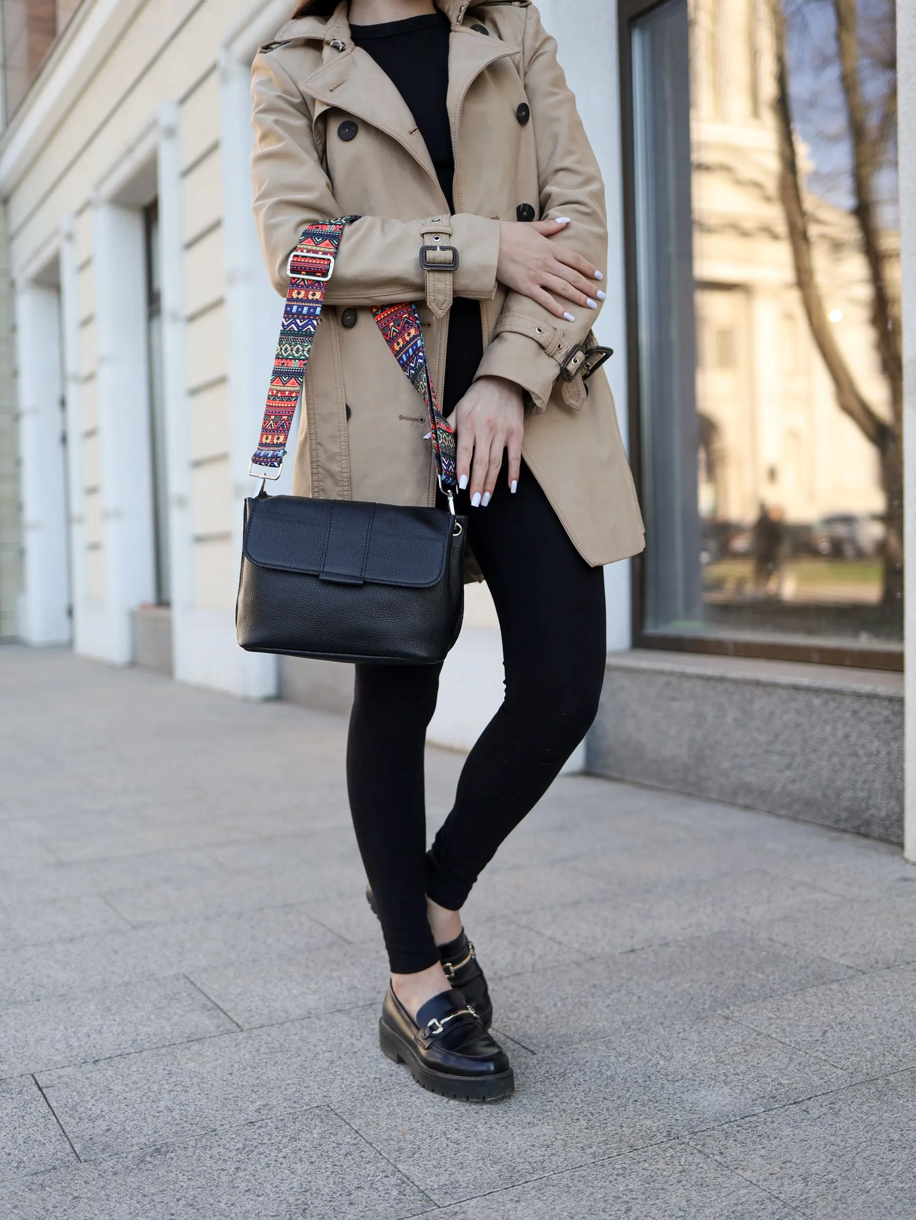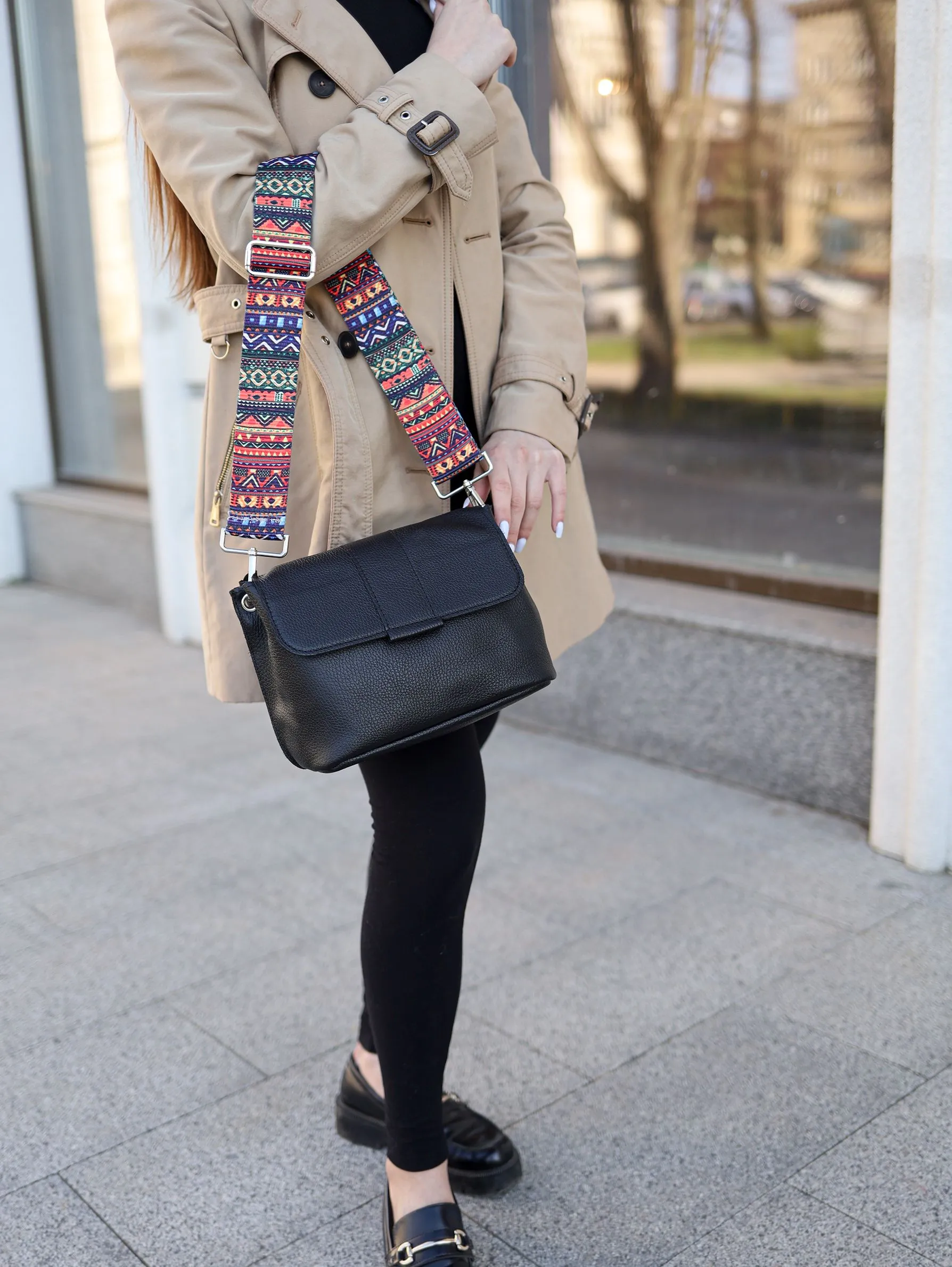 Жіноча сумка крос-боді Miros Марокко чорного кольору виконана з натуральної шкіри флотар. Сумка оснащена якісною металевою фурнітурою. Має три відділення, одне відкрите, одне на металевій блискавці та одне на кнопці. Закривається сумка також на кнопку. Ремінець регулюється від 80 см до 115 см. Завдяки такій стильній жіночій сумочці ви будете виділятись серед натовпу і мати із собою завжди все необхідне.