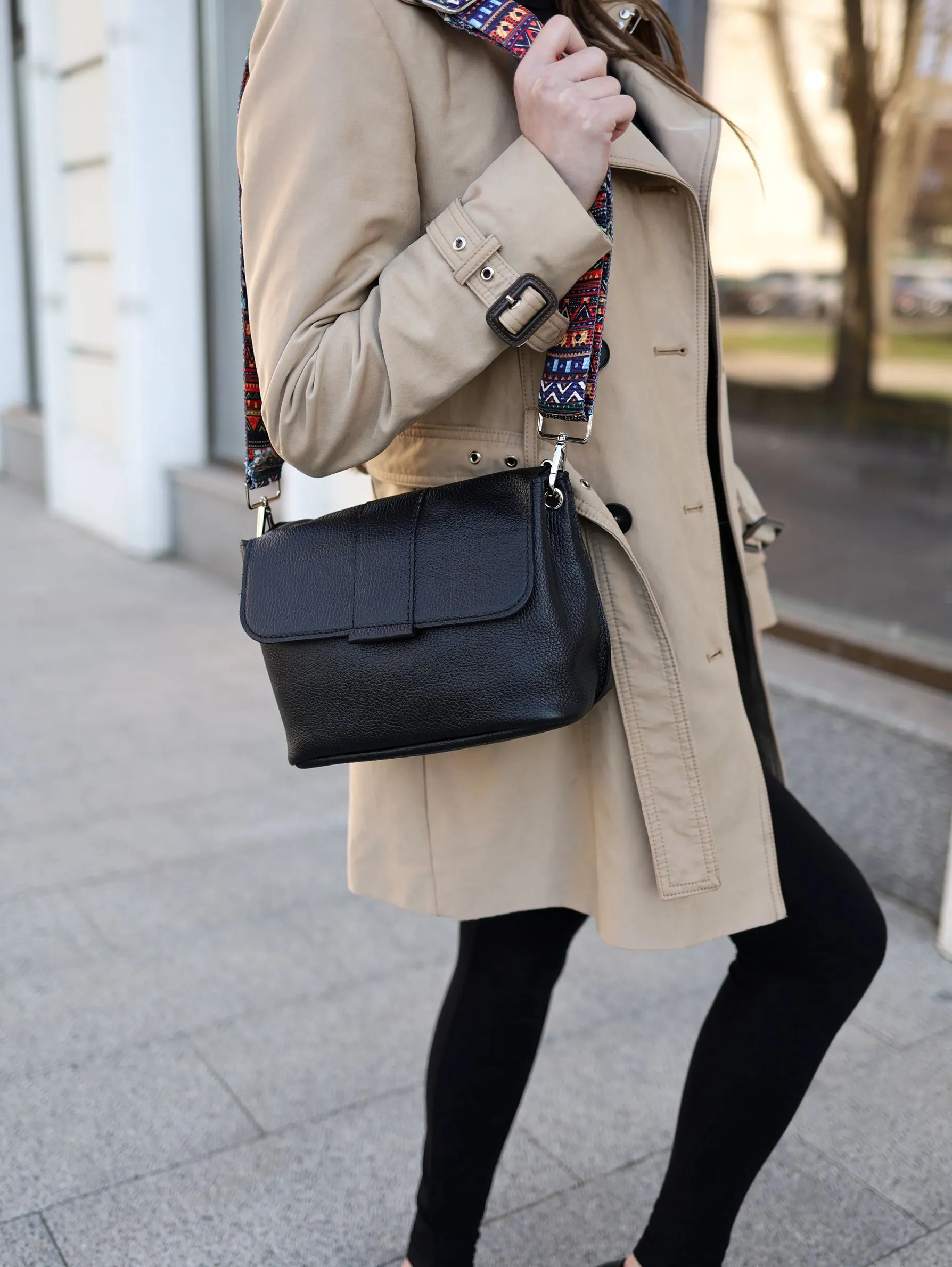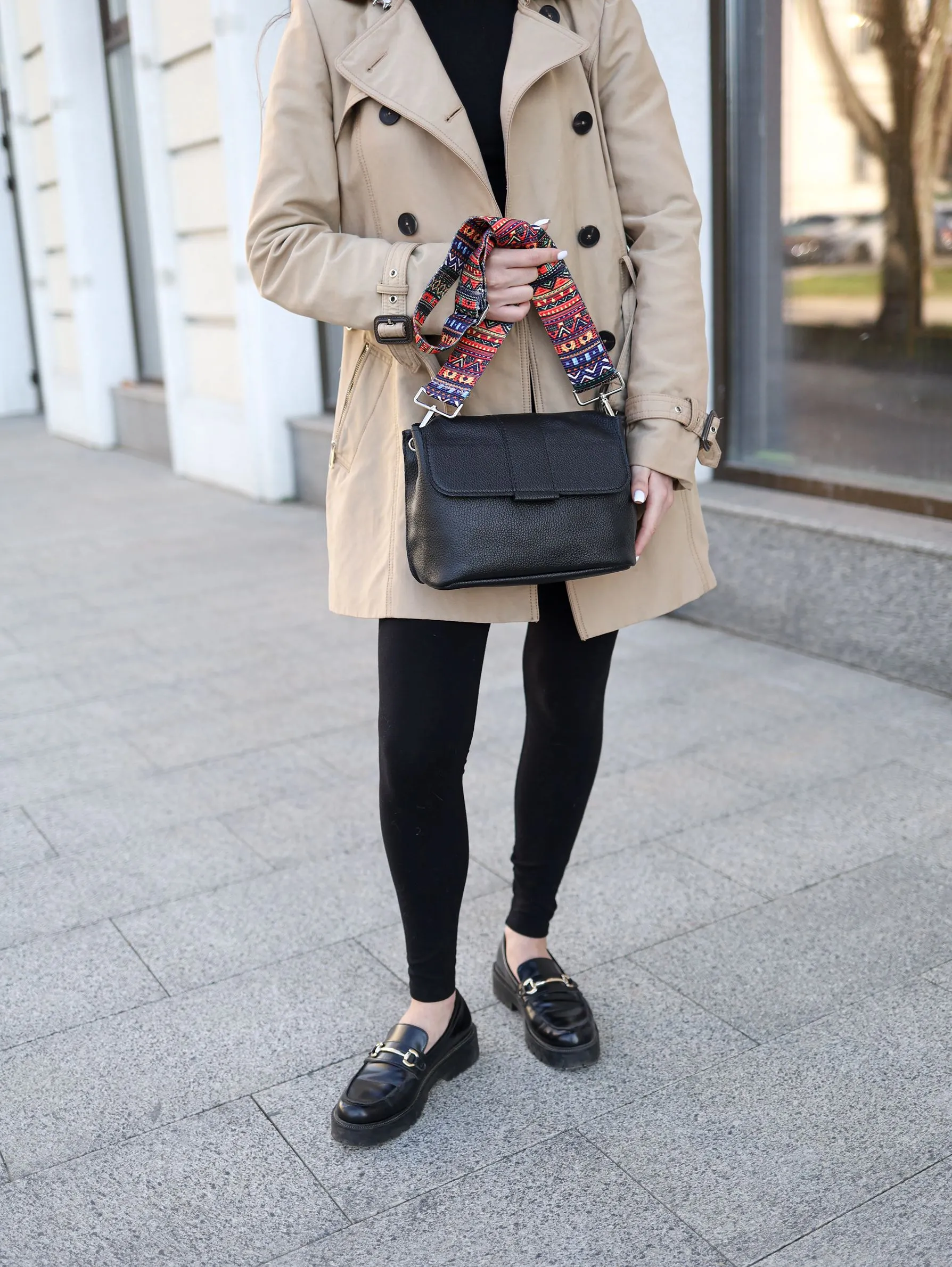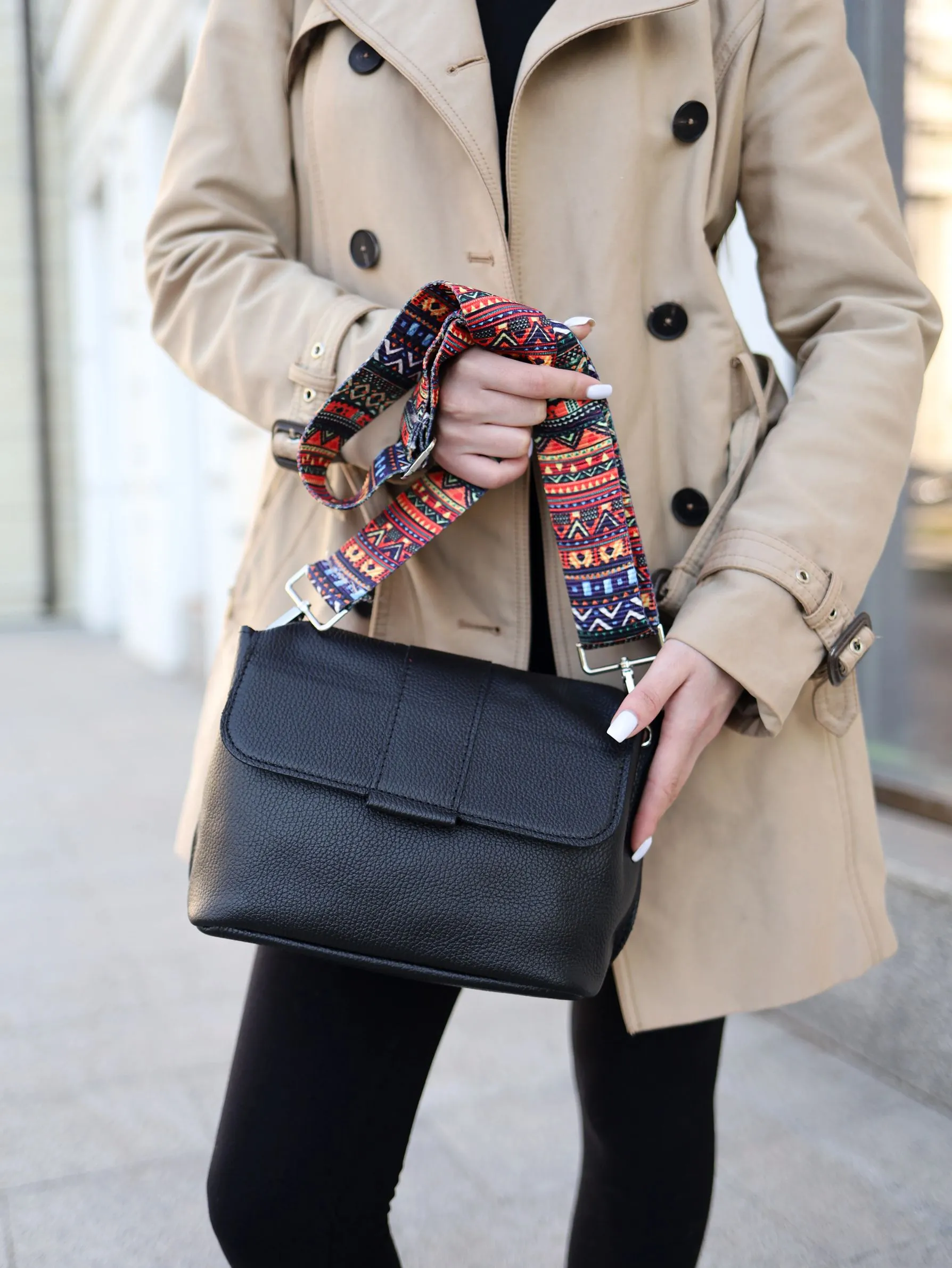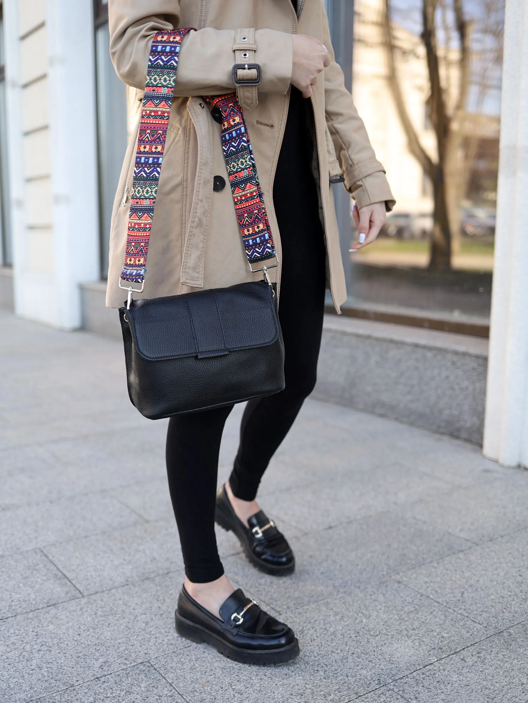 Жіноча сумка крос-боді Miros Марокко чорного кольору виконана з натуральної шкіри флотар. Сумка оснащена якісною металевою фурнітурою. Має три відділення, одне відкрите, одне на металевій блискавці та одне на кнопці. Закривається сумка також на кнопку. Ремінець регулюється від 80 см до 115 см. Завдяки такій стильній жіночій сумочці ви будете виділятись серед натовпу і мати із собою завжди все необхідне.