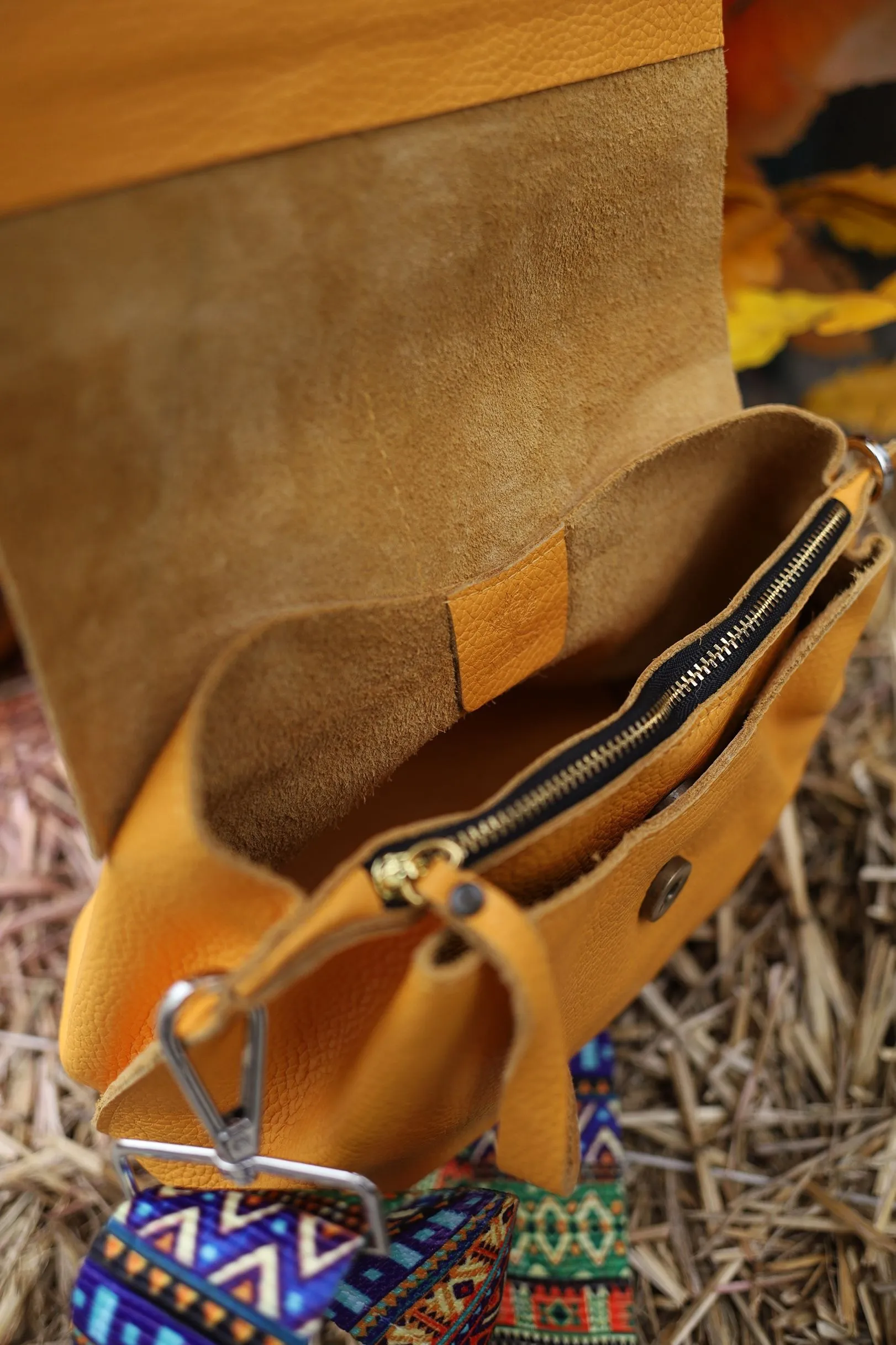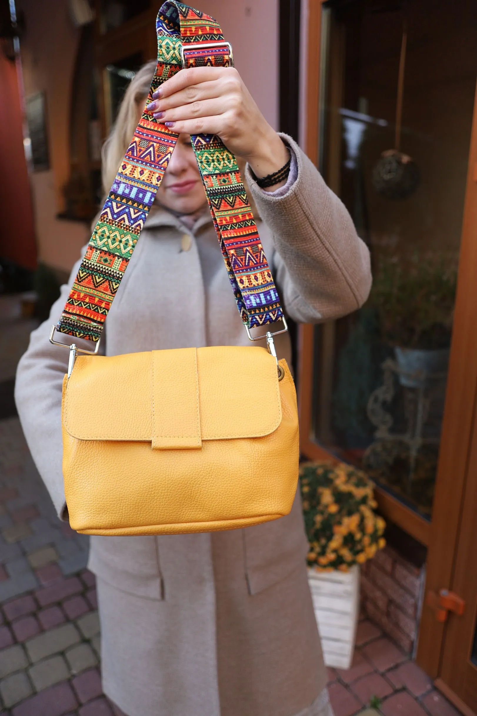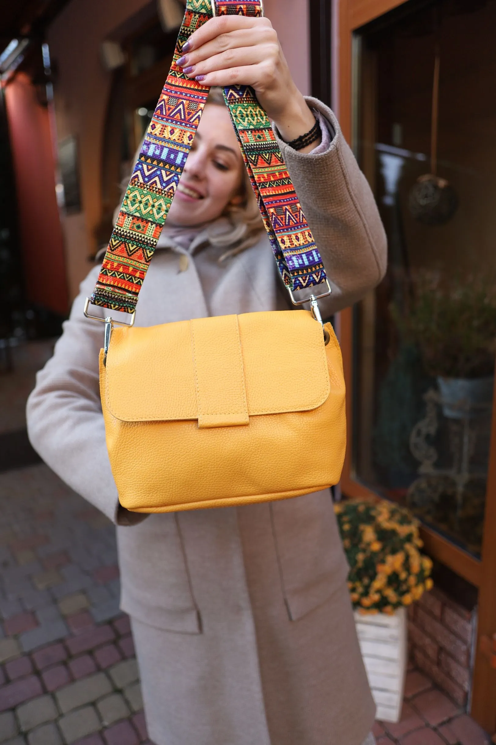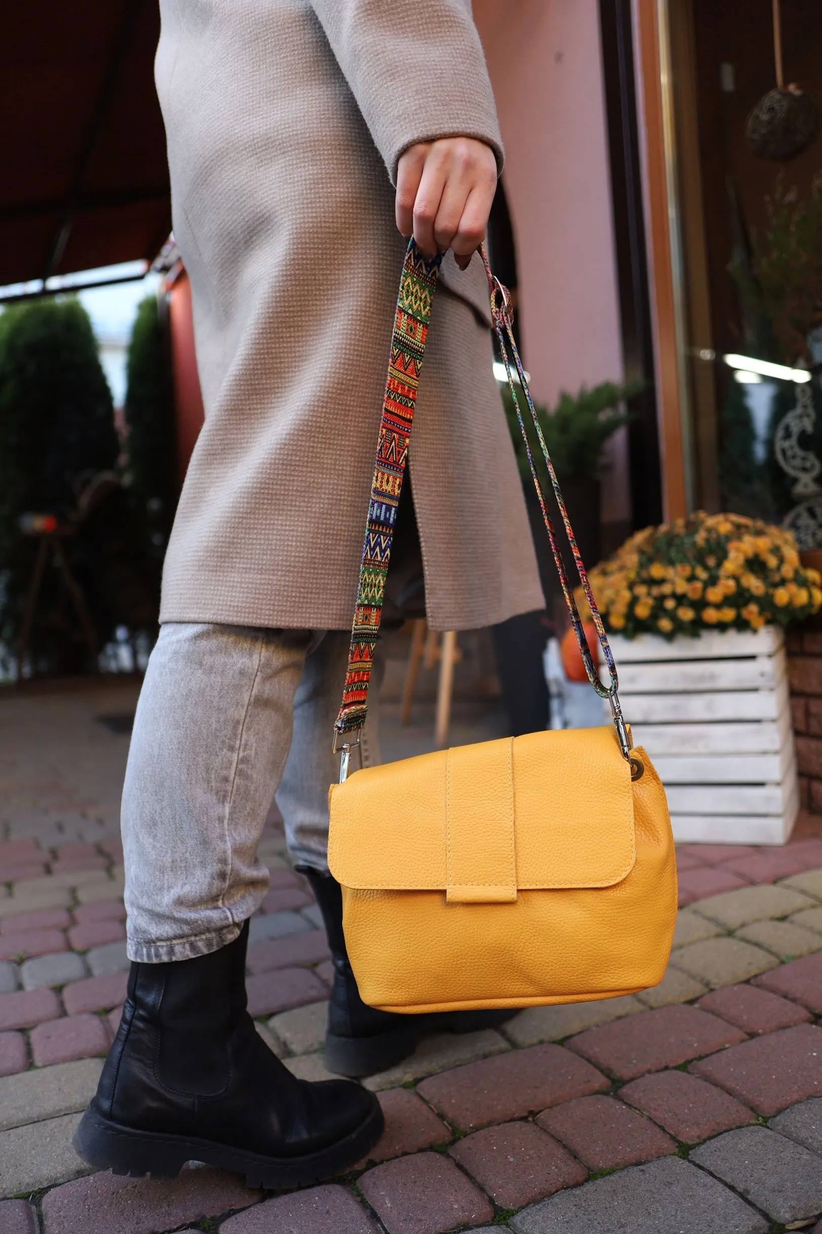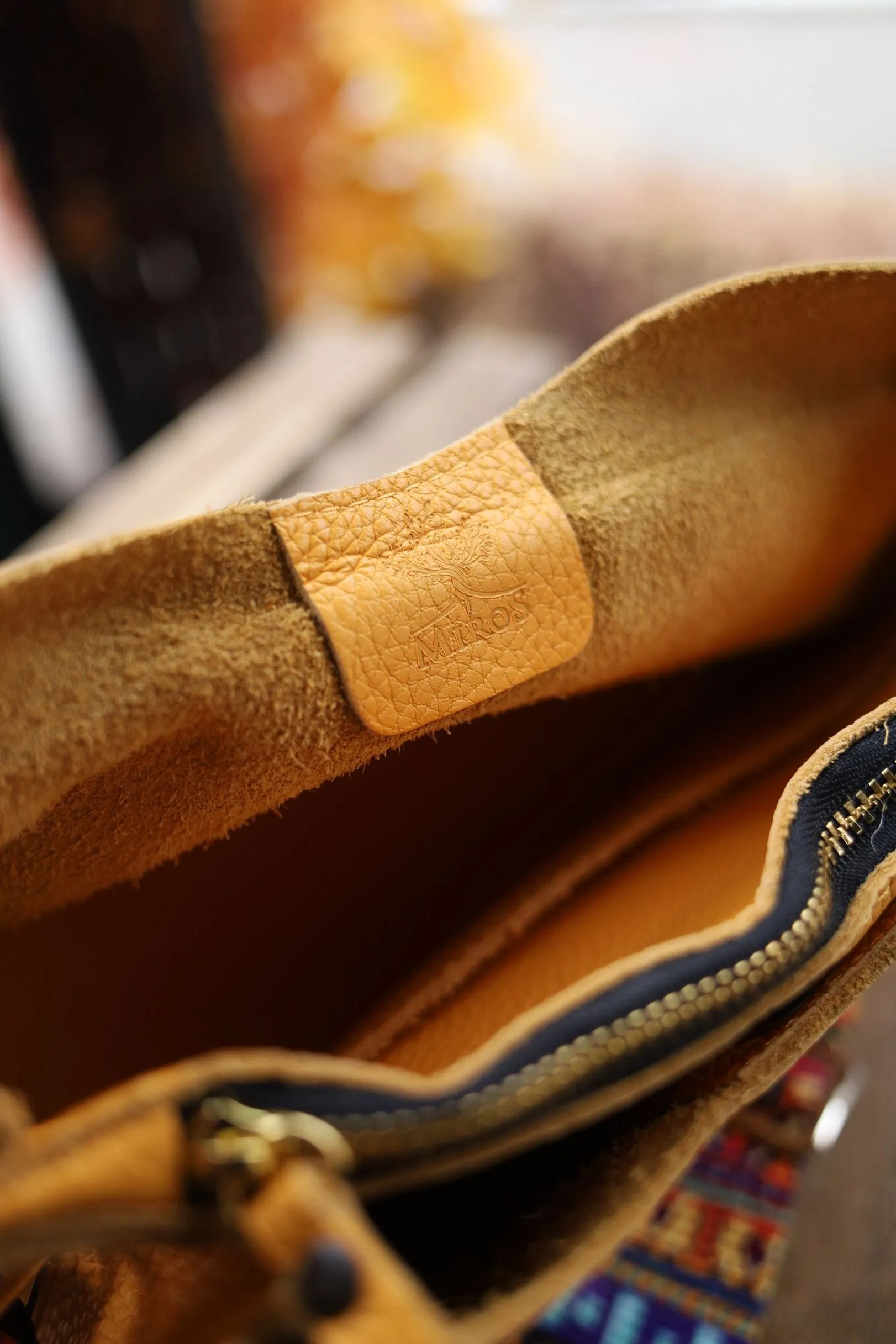 Жіноча сумка крос-боді Miros Марокко жовтого кольору виконана з натуральної шкіри флотар. Сумка оснащена якісною металевою фурнітурою. Має три відділення, одне відкрите, одне на металевій блискавці та одне на кнопці. Закривається сумка також на кнопку. Ремінець регулюється від 80 см до 115 см. Завдяки такій стильній жіночій сумочці ви будете виділятись серед натовпу і мати із собою завжди все необхідне.