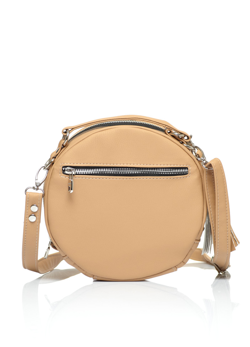 Кругла жіноча сумка крос-боді Sambag Bale бежевого кольору з білою вставкою виконана з якісної екошкіри. Має одне основне відділення на блискавці всередині якого дві кишені, одна відкрита та одна на блискавці. Підкладка із матеріалу Оксфорд. Також є додаткова зовнішня кишеня з тильної сторони на блискавці. Сумка оснащена металевою фурнітурою. Дно тверде укриіплене. Ручка та ремінець для носіння через плече з надійної екошкіри. Ремінець регулюється та кріпиться до сумки на карабіни, тому його за необхідністю можна зняти.