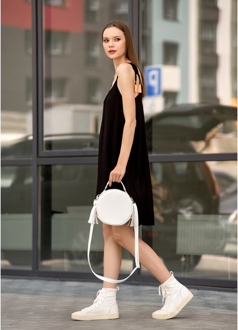 Кругла жіноча сумка крос-боді Sambag Bale білого кольору виконана з якісної екошкіри. Має одне основне відділення на блискавці всередині якого дві кишені, одна відкрита та одна на блискавці. Підкладка із матеріалу Оксфорд. Також є додаткова зовнішня кишеня з тильної сторони на блискавці. Сумка оснащена металевою фурнітурою. Дно тверде укриіплене. Ручка та ремінець для носіння через плече з надійної екошкіри. Ремінець регулюється та кріпиться до сумки на карабіни, тому його за необхідністю можна зняти.