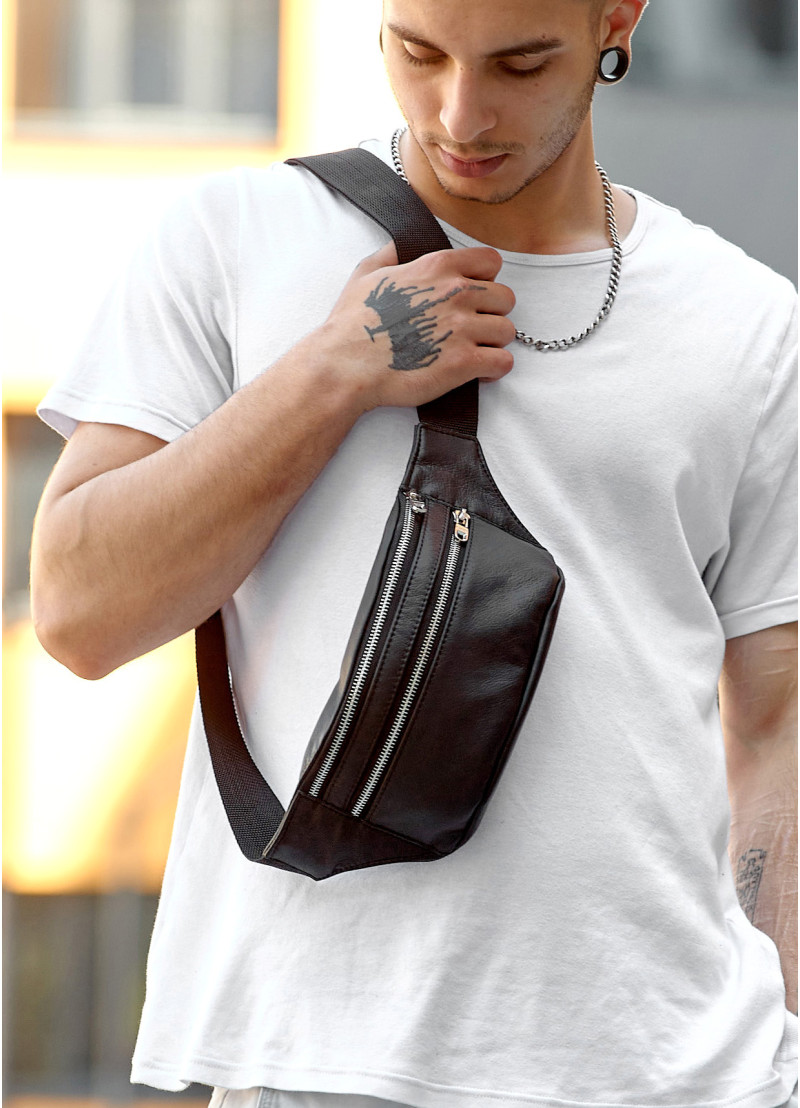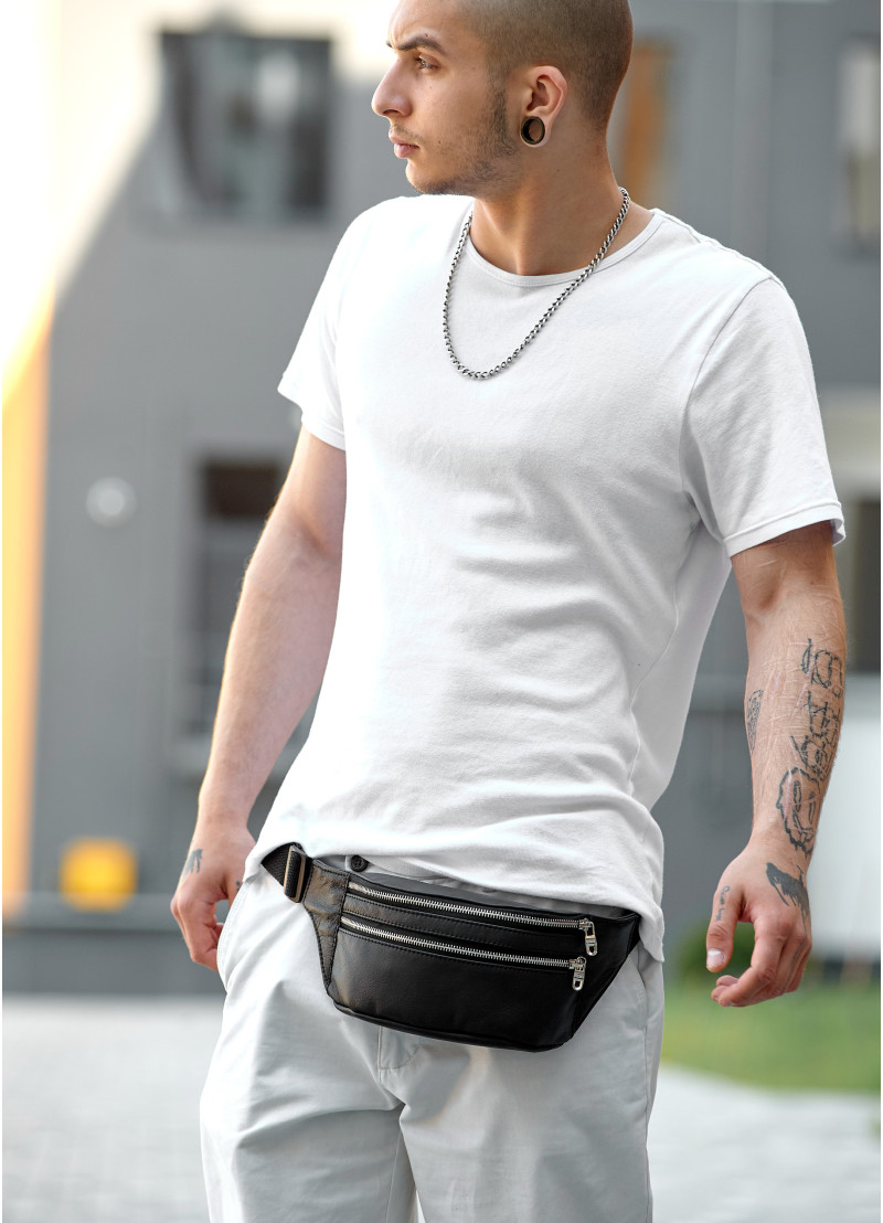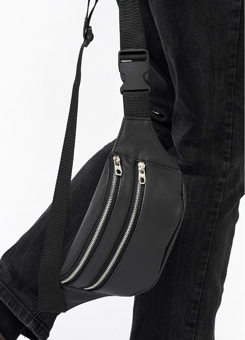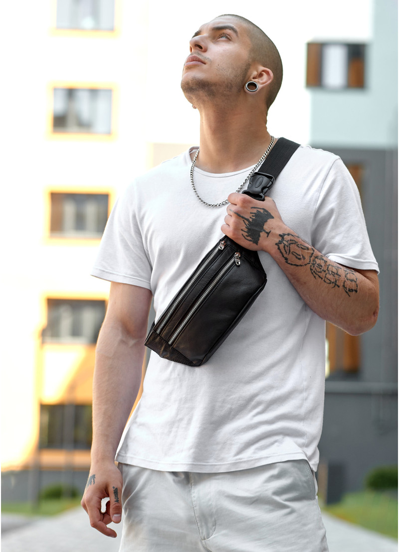 Мужская бананка Sambag Tirso Bts черного цвета выполнена из натуральной кожи, обладающей водоотталкивающими свойствами. В середине подкладка из материала оксфорда. Подкладка берет на себя нагрузку, благодаря чему срок службы бананки значительно увеличивается. Она имеет качественную металлическую молнию с металлическими бегунками с фиксаторами, поэтому сумка самостоятельно открываться не будет. Спереди и сзади бананка имеет дополнительные карманы на молнии. Внутри сумка поделена на несколько отделений. Ремешок регулируется от 86 до 123 см, благодаря чему ее можно удобно носить как на поясе, так и через плечо.