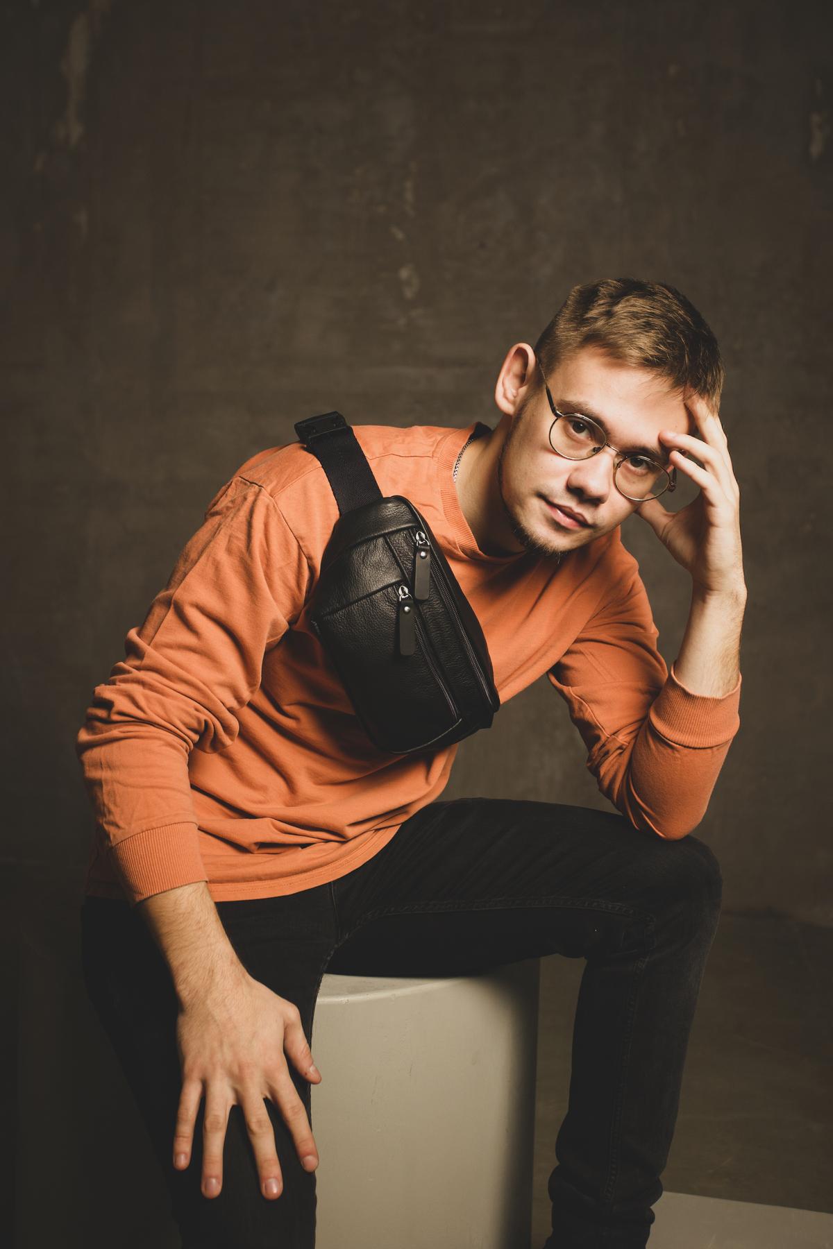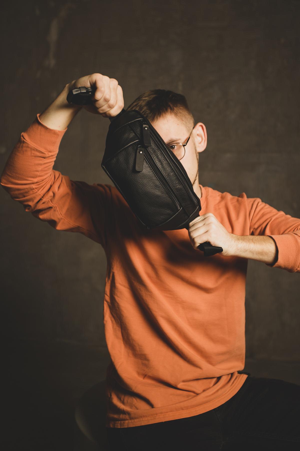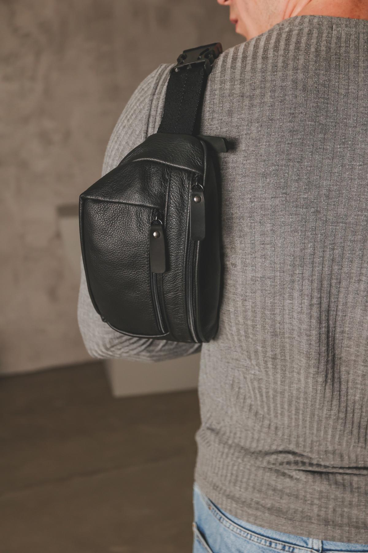 Мужская бананка Skill черного цвета выполнена из натуральной кожи КРС. У бананки одно основное отделение, а также дополнительные отделения спереди и сзади на пластиковых молниях. Ремешок регулируется до 120 см.