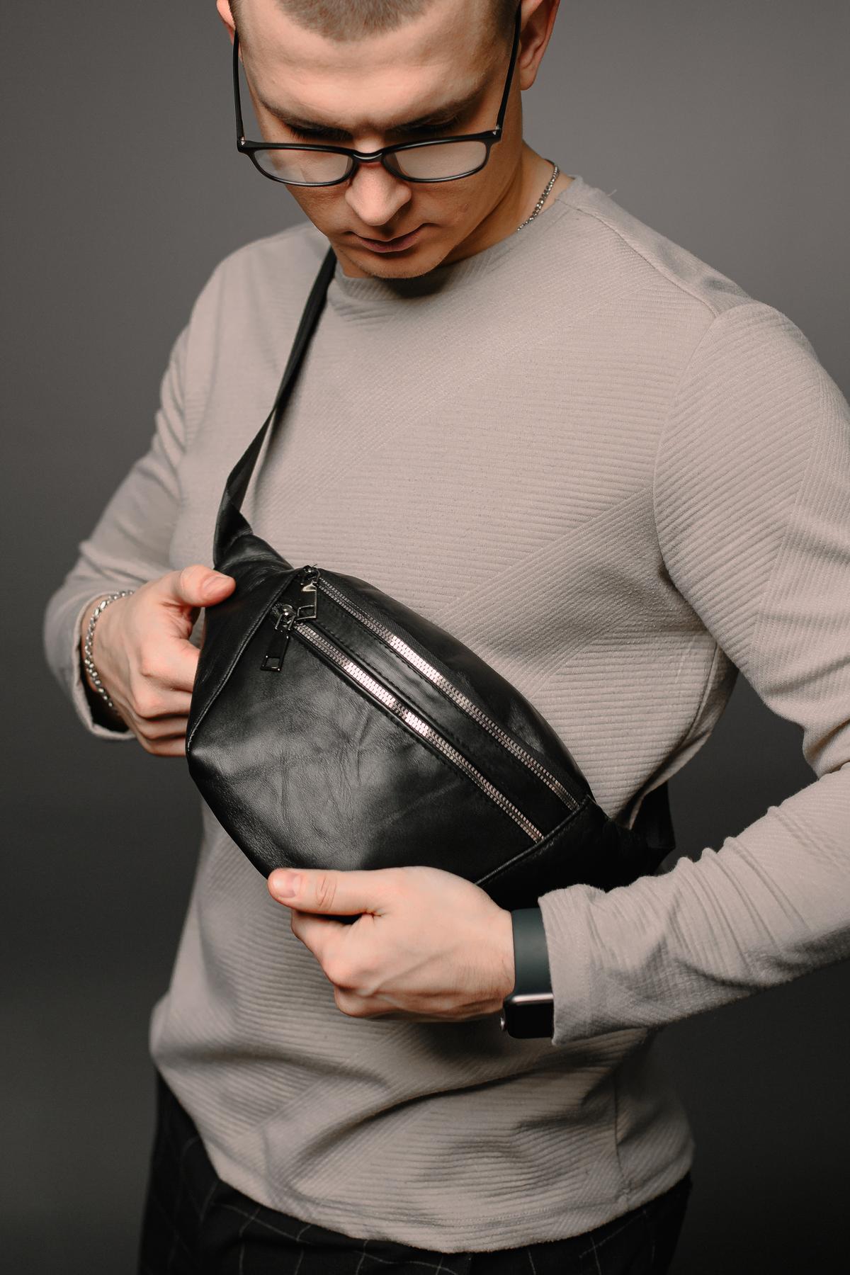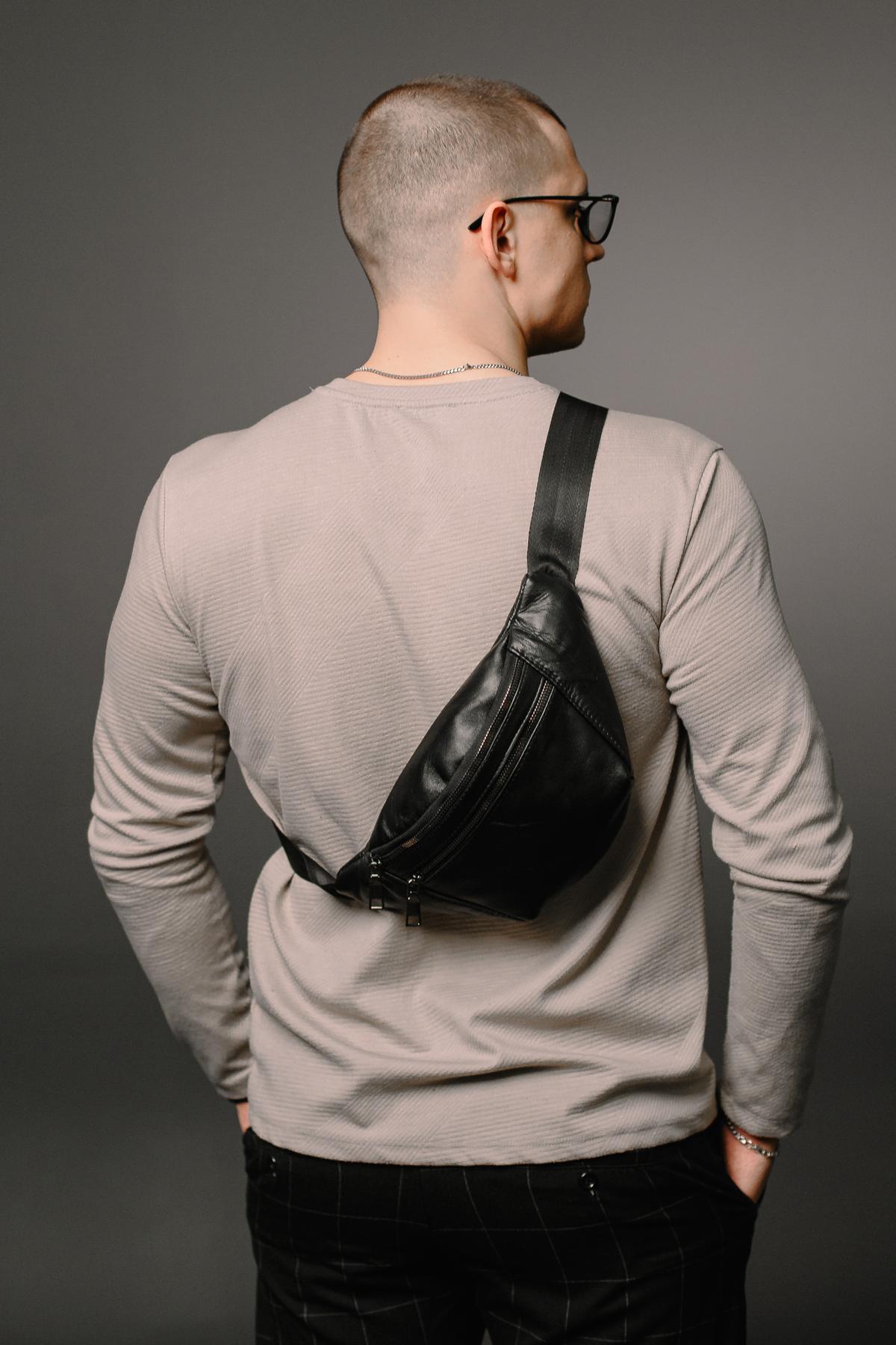 Мужская бананка Skill черного цвета выполнена из натуральной овечьей кожи. У бананки одно основное отделение и два дополнительных спереди и сзади, все на металлической молнии. Ремешок регулируется до 125 см. Бананка достаточно большая, поэтому вы сможете поместить в нее все необходимые вещи.