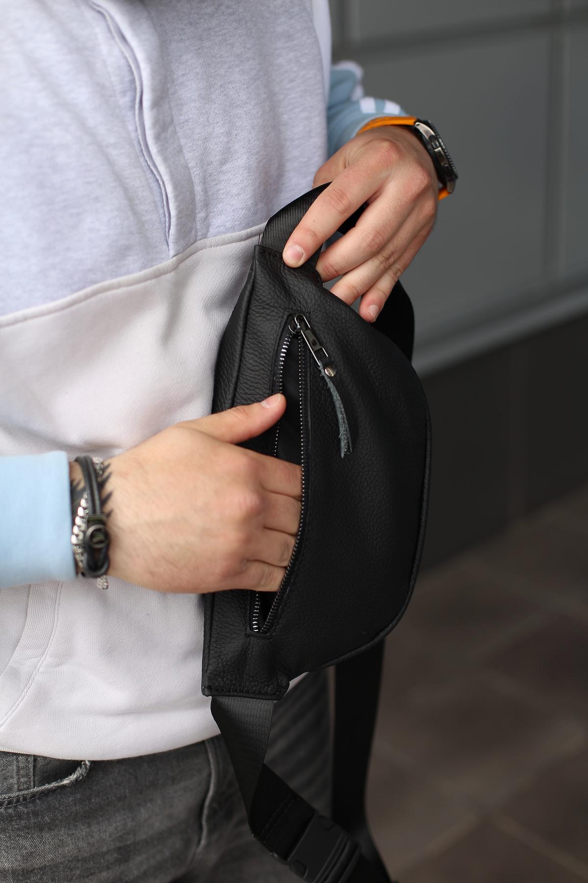 Мужская бананка Skill Line черного цвета выполнена из натуральной кожи КРС. У бананки одно основное отделение, внутренний карман на молнии, а также дополнительное отделение сзади. Все отделения и карман на металлической молнии. Ремешок регулируется до 105 см.