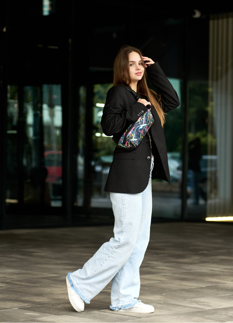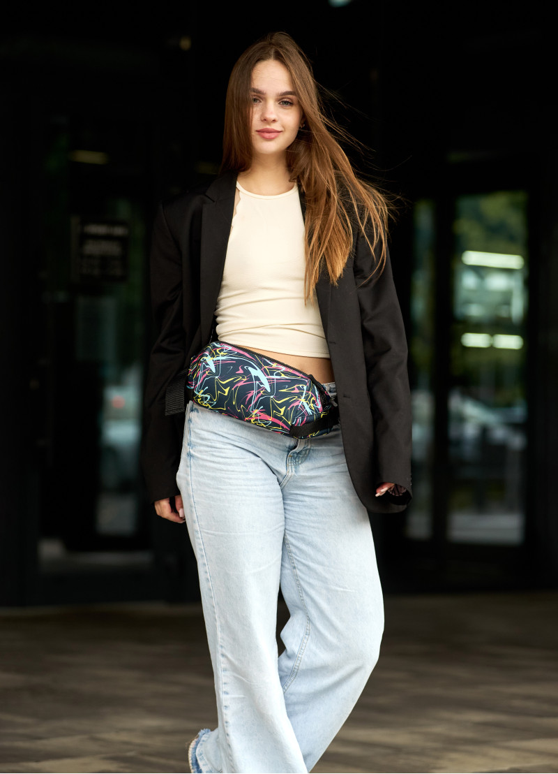 Женская тканевая бананка Sambag Holster MSH цвета нави с принтом выполнена из ткани Оксфорд, которая обладает водоотталкивающими свойствами. Подложка также выполнена из данного материала. Сумка оснащена металлической молнией и металлическими бегунками с фиксаторами, поэтому сумка самостоятельно открываться не будет. Сзади бананка имеет дополнительный карман на молнии. Внутри одно основное отделение с несколькими карманами. Ремешок регулируется от 100 до 145 см.