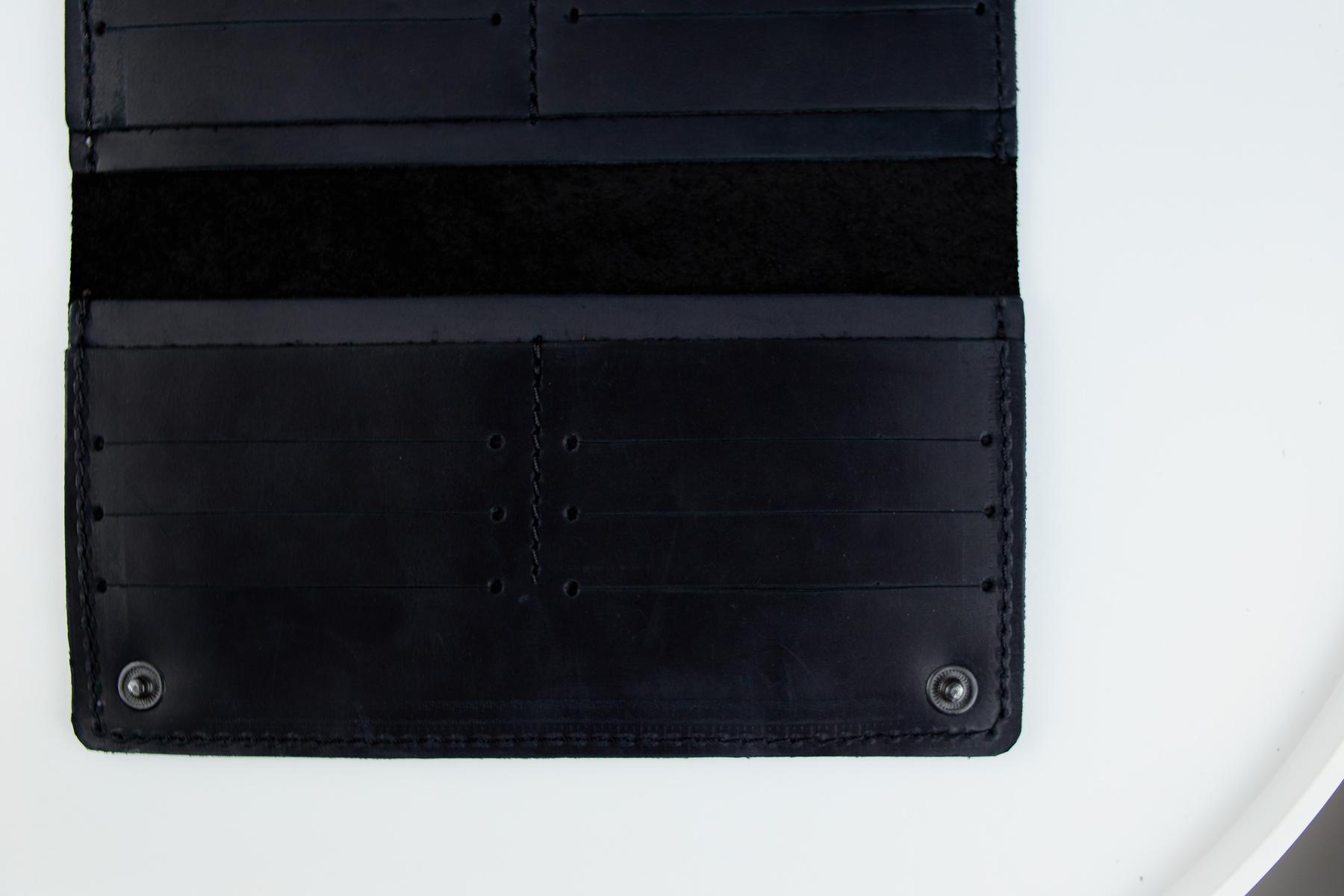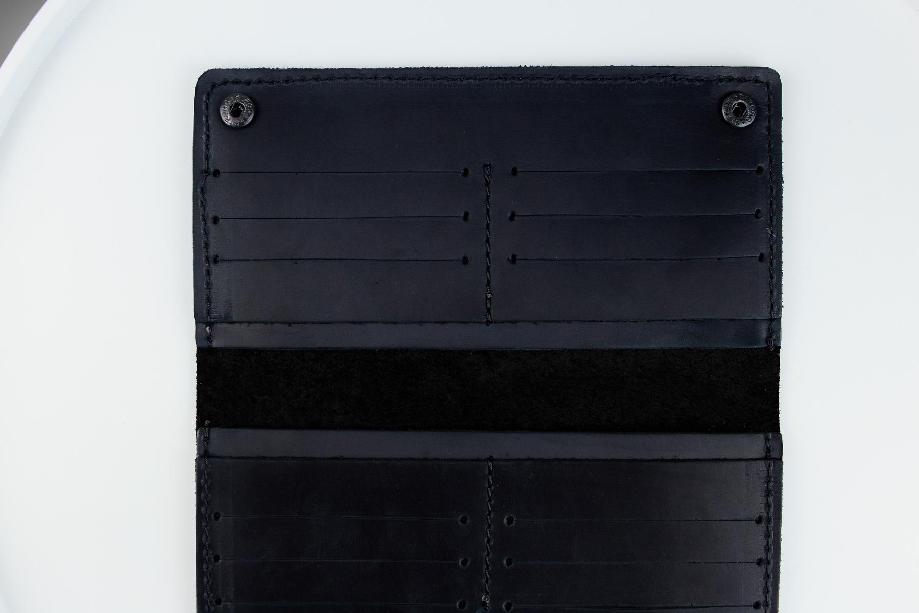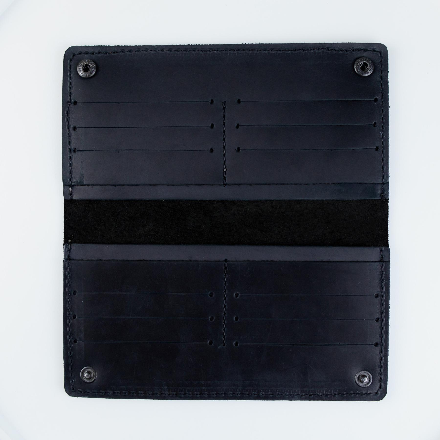 Мужское портмоне Skill Crazy Horse черного цвета изготовлено из натуральной кожи. Портмоне застегивается на металлические кнопки, имеет два основных отделения для купюр и 12 ячеек для карточек.