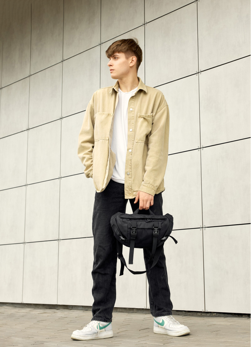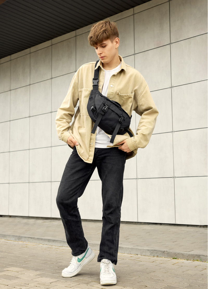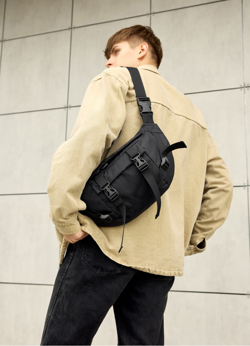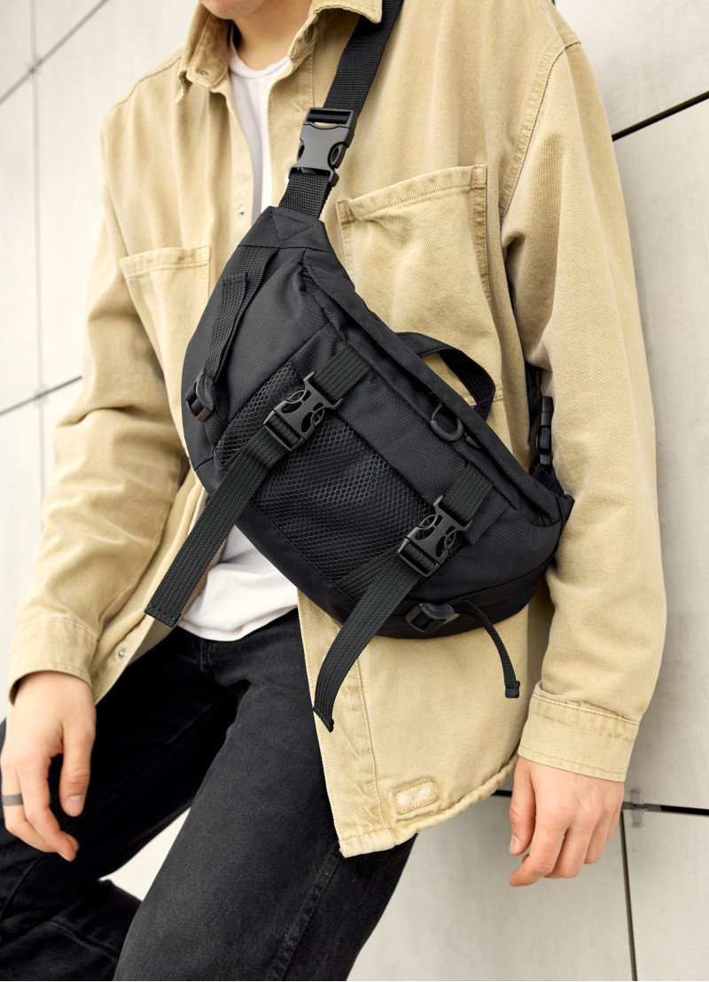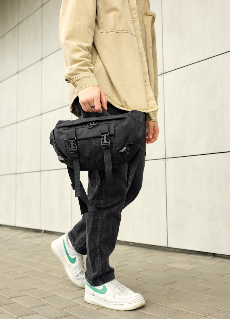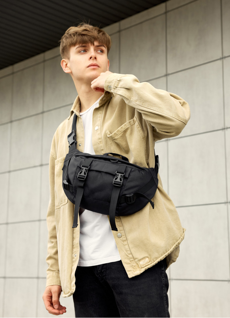 Мужская сумка-бананка Sambag Dynamicdart с бело-черным пальмовым принтом имеет 9 отделений и выполнена из качественного полиэстера. В середине подкладка из материала Оксфорд. Сумка имеет качественную пластиковую молнию с металлическими бегунками с фиксаторами, поэтому сумка самостоятельно открываться не будет. Кроме основного отделения бананка имеет два открытых кармана, один большой карман на молнии в котором еще три открытых кармана. На наружной стороне спереди карман из сетки. Сззади бананки два открытых кармана. Ремешок регулируется от 86 см до 168 см, благодаря чему ее можно удобно носить как поясную сумку, так и как полноценную через плечо.