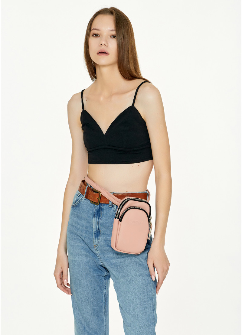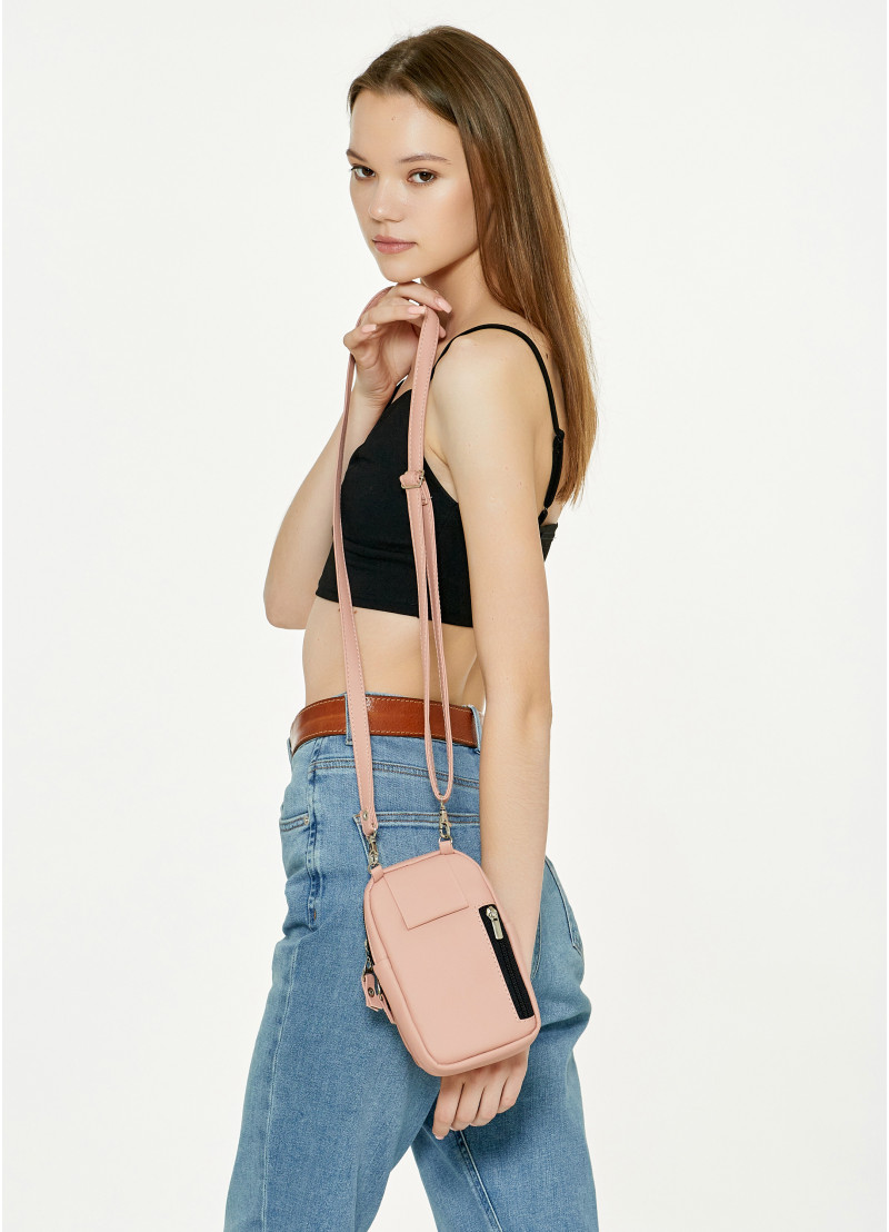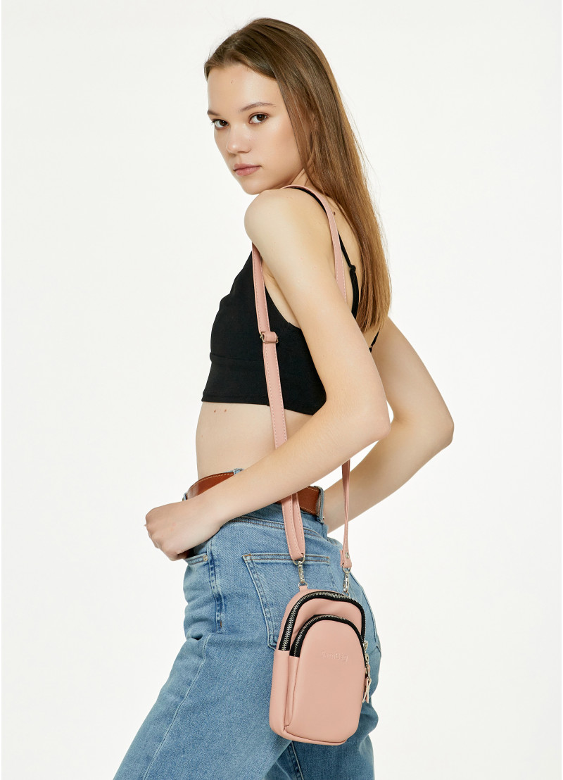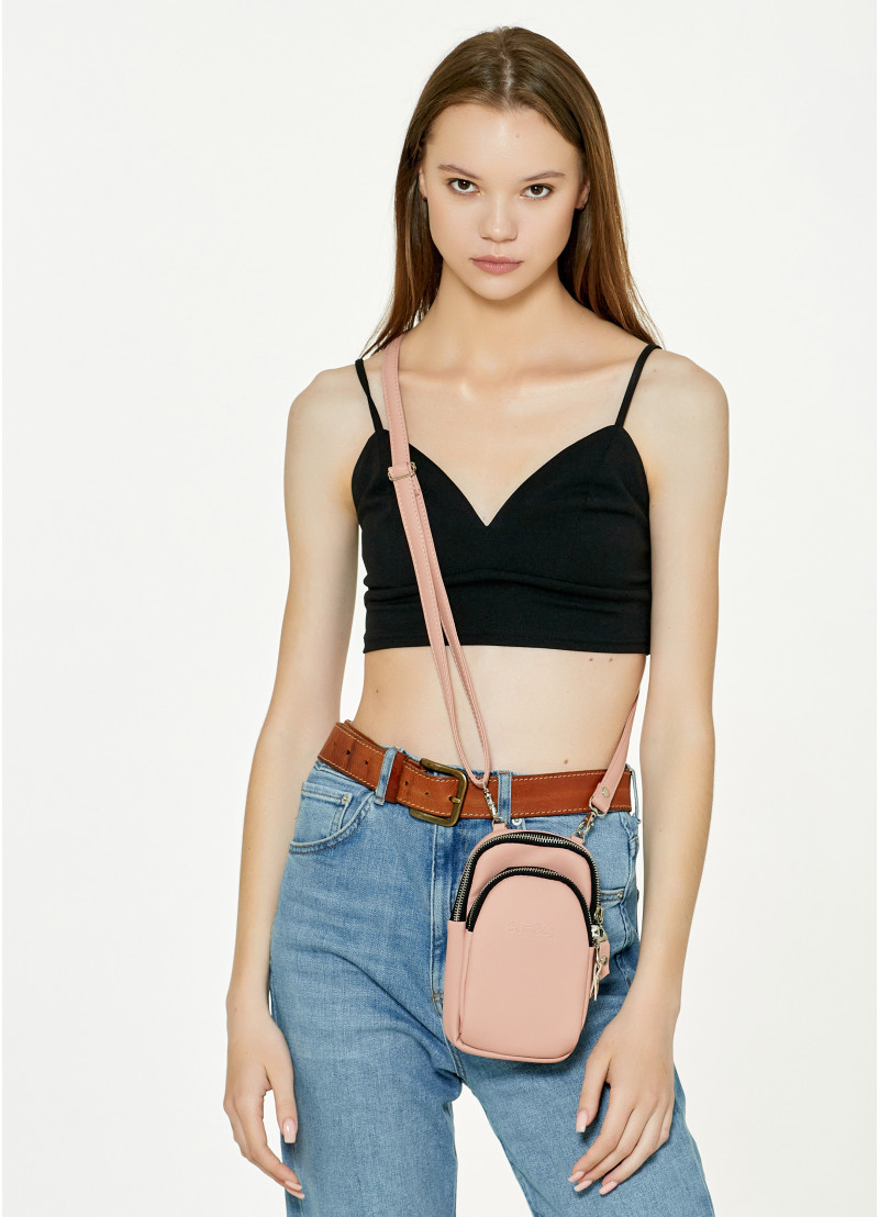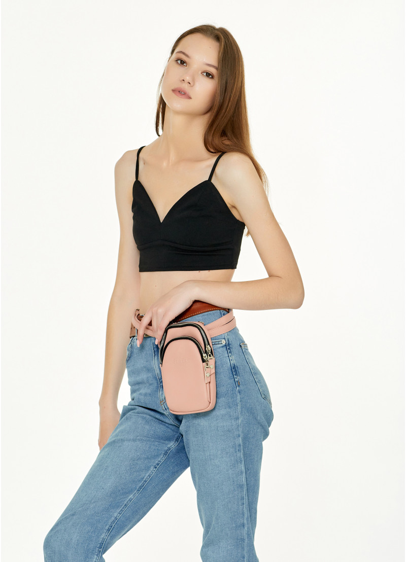 Женская сумка для телефона Sambag пудрового цвета выполнена из качественной износостойкой экокожи.