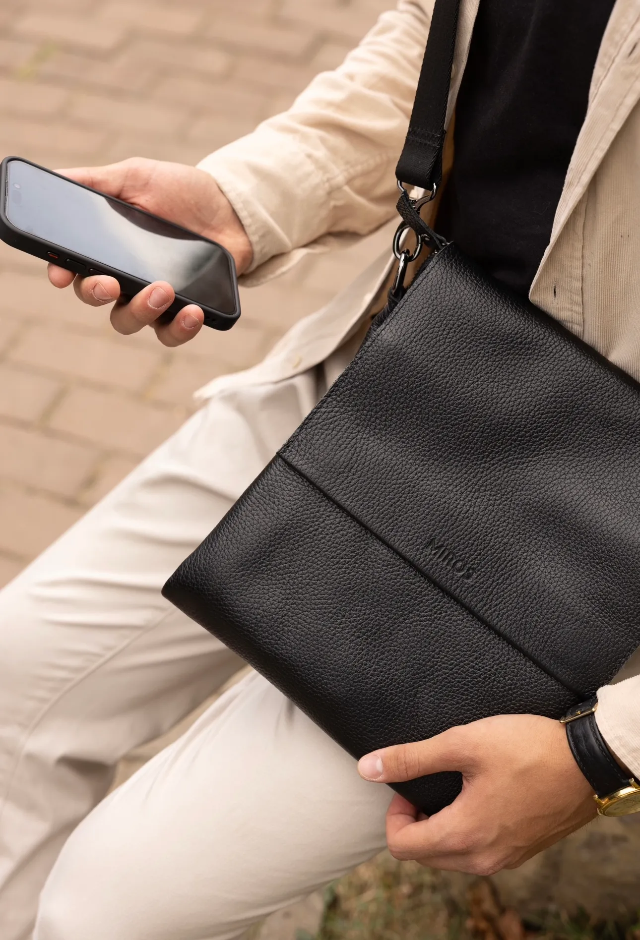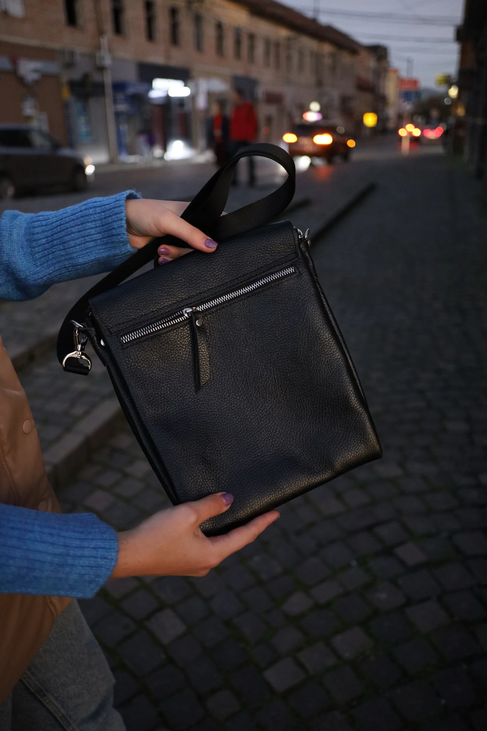 Сумка мессенджер Лондон черного цвета выполнена из натуральной кожи и имеет текстильный практичный ремень, благодаря которому ее можно удобно носить через плечо. Она отлично подойдет как под деловой, так и под повседневный стиль.