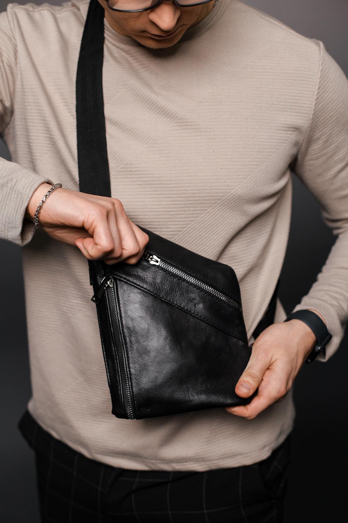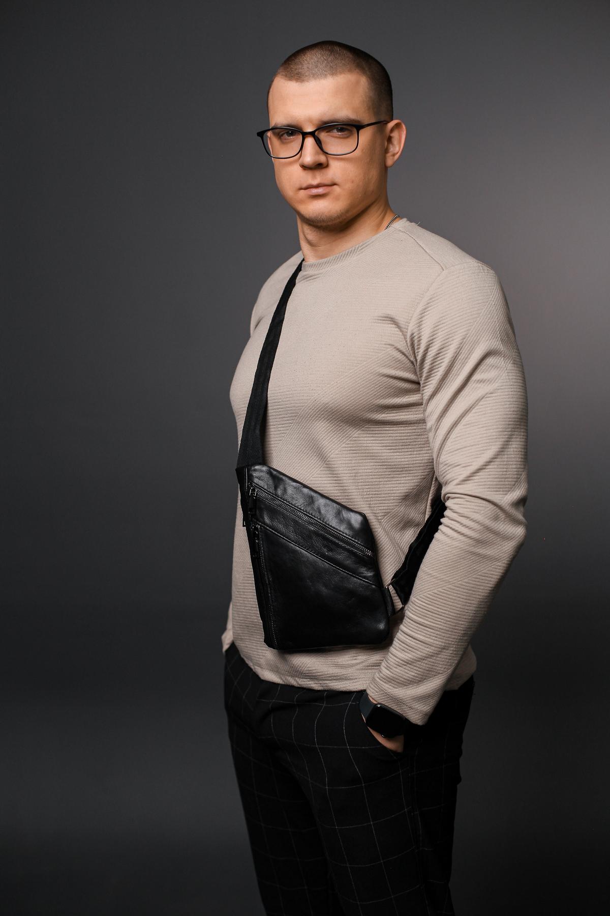 Мужская слинг сумка Skill черного цвета выполнена из натуральной кожи. Основное отделение на вертикальной молнии, одно дополнительное отделение с лицевой стороны и одно с тыльной стороны, также на молниях. Максимальная длина ремешка 125 см. Слинг сумки подойдет мужчинам, которые постоянно в движении и при этом всегда хотят выглядеть стильно.